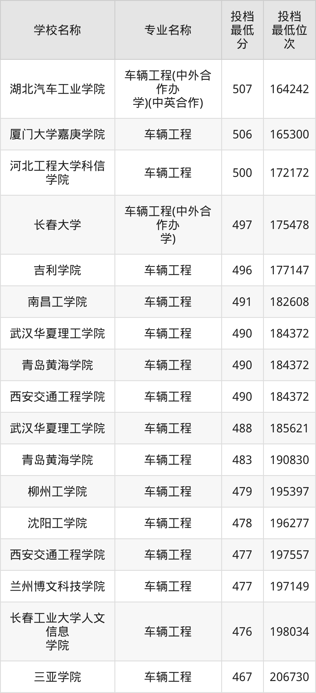 低于496分能上的车辆工程专业大学全部为民办性质,录取分数线最低的公办大学是长春大学,2025年最低分497分,即高考生至少需要超过本科线7分及以上才有机会被公办本科大学的车辆工程专业录取。