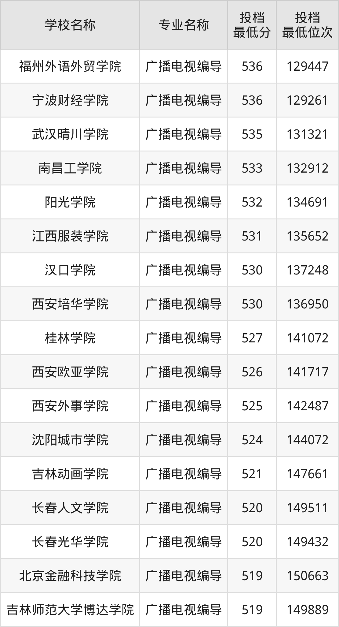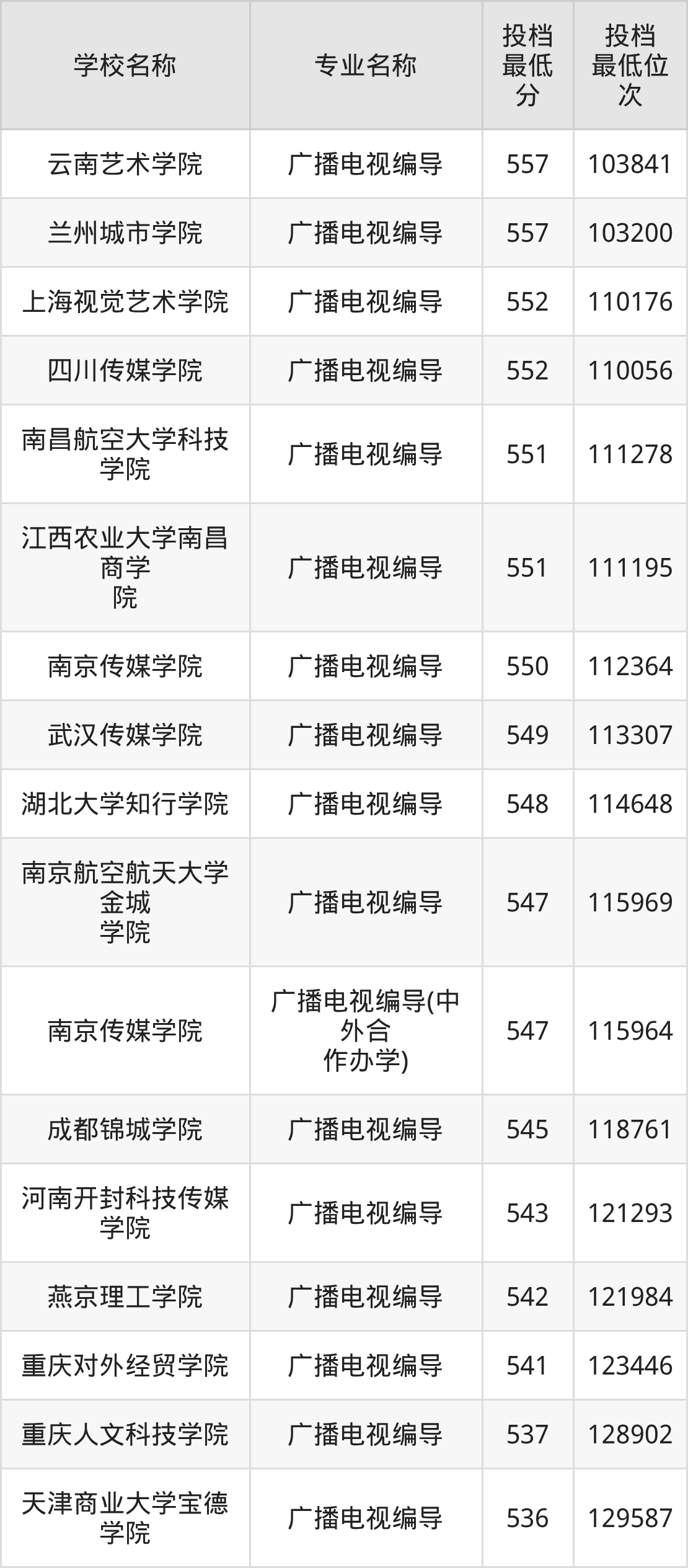 低于556分能上的广播电视编导专业大学全部为民办性质,录取分数线最低的公办大学是兰州城市学院,2025年最低分557分,即高考生至少需要超过本科线67分及以上才有机会被公办本科大学的广播电视编导专业录取。