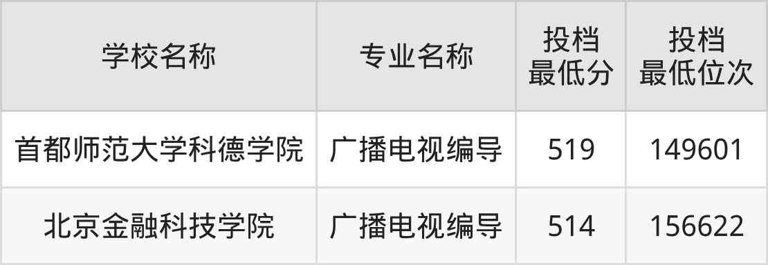 广播电视编导分数最低的本科学校是北京金融科技学院,2025年最低分514分,超本科线24分。收分最高的是华东师范大学,广播电视编导2025年最低分662分,对应全省排名是6200名,超本科线172分才能上。