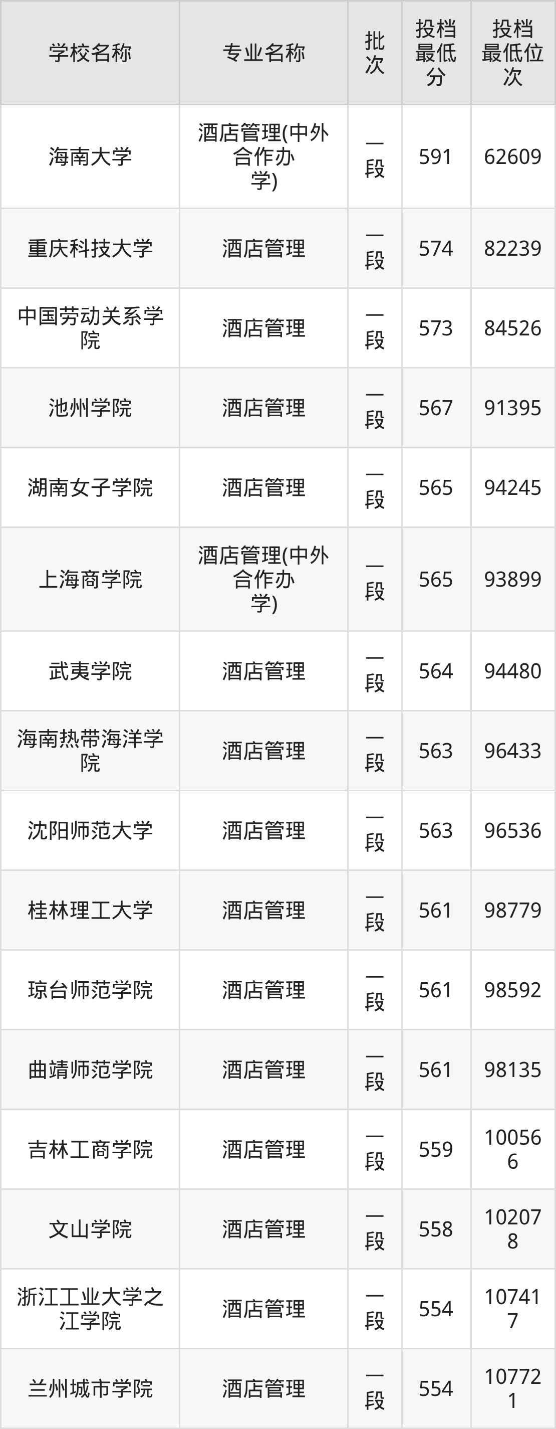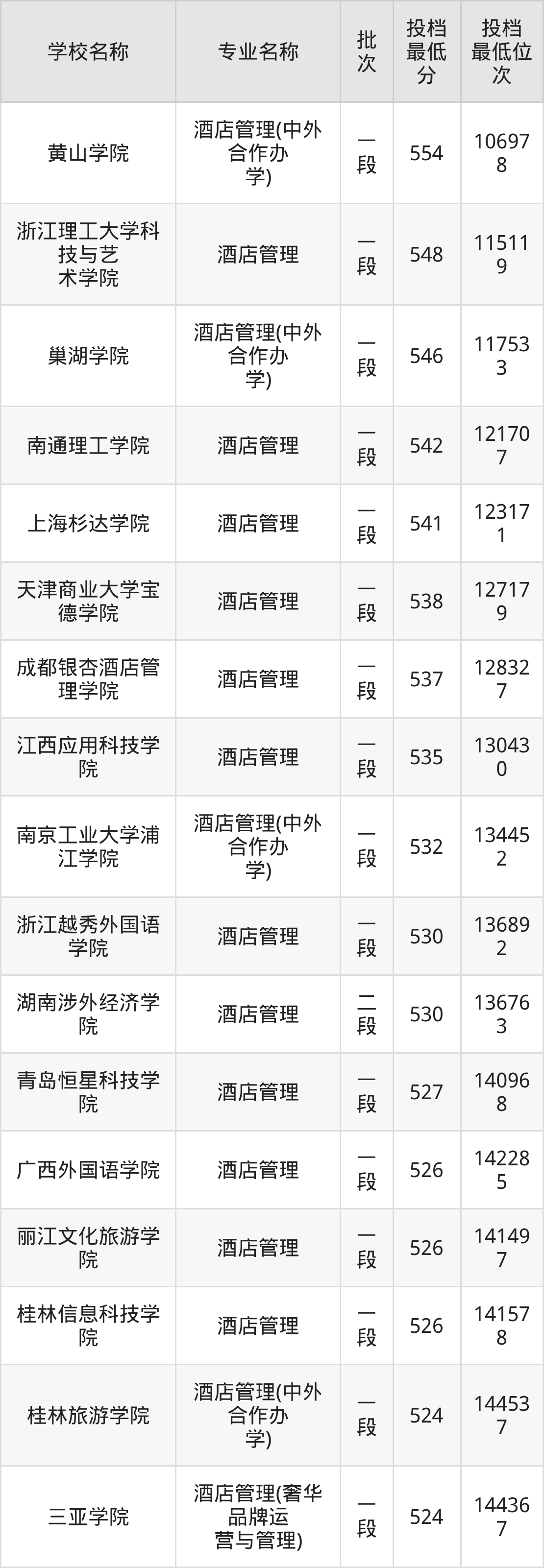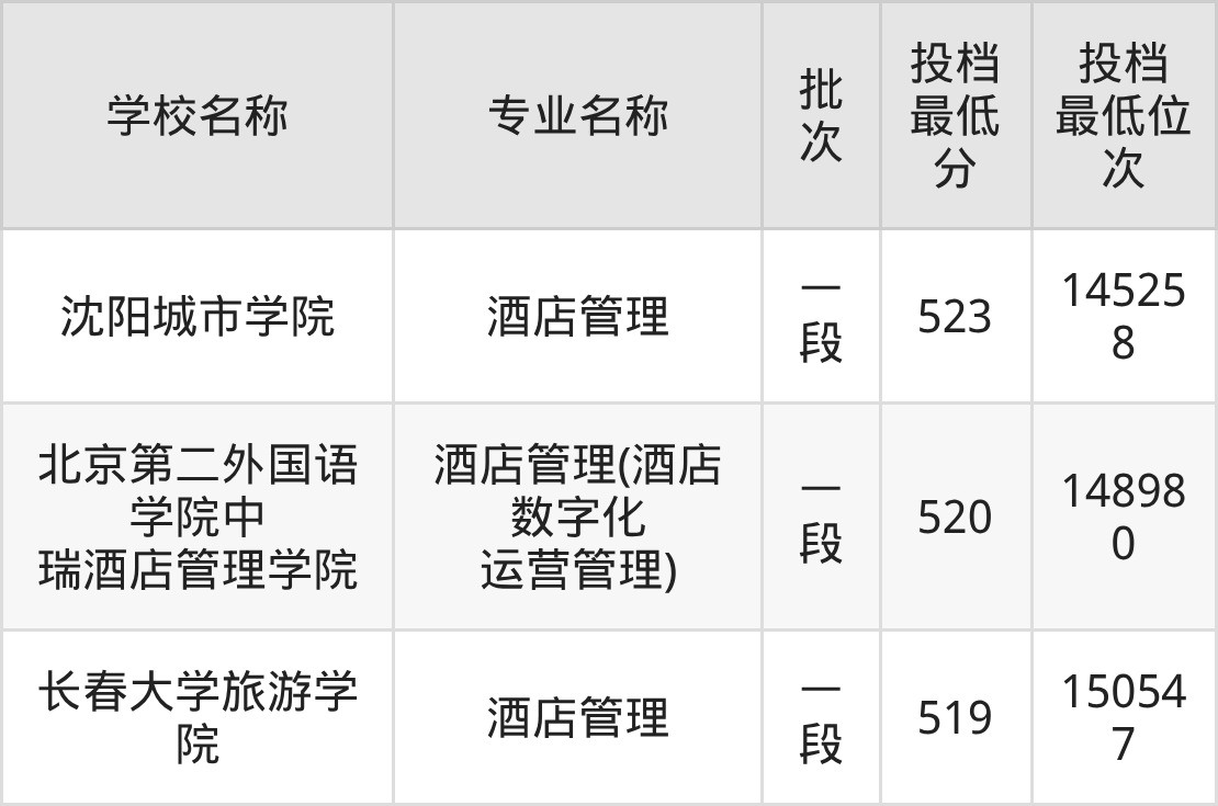 一、酒店管理专业2025年录取分数线