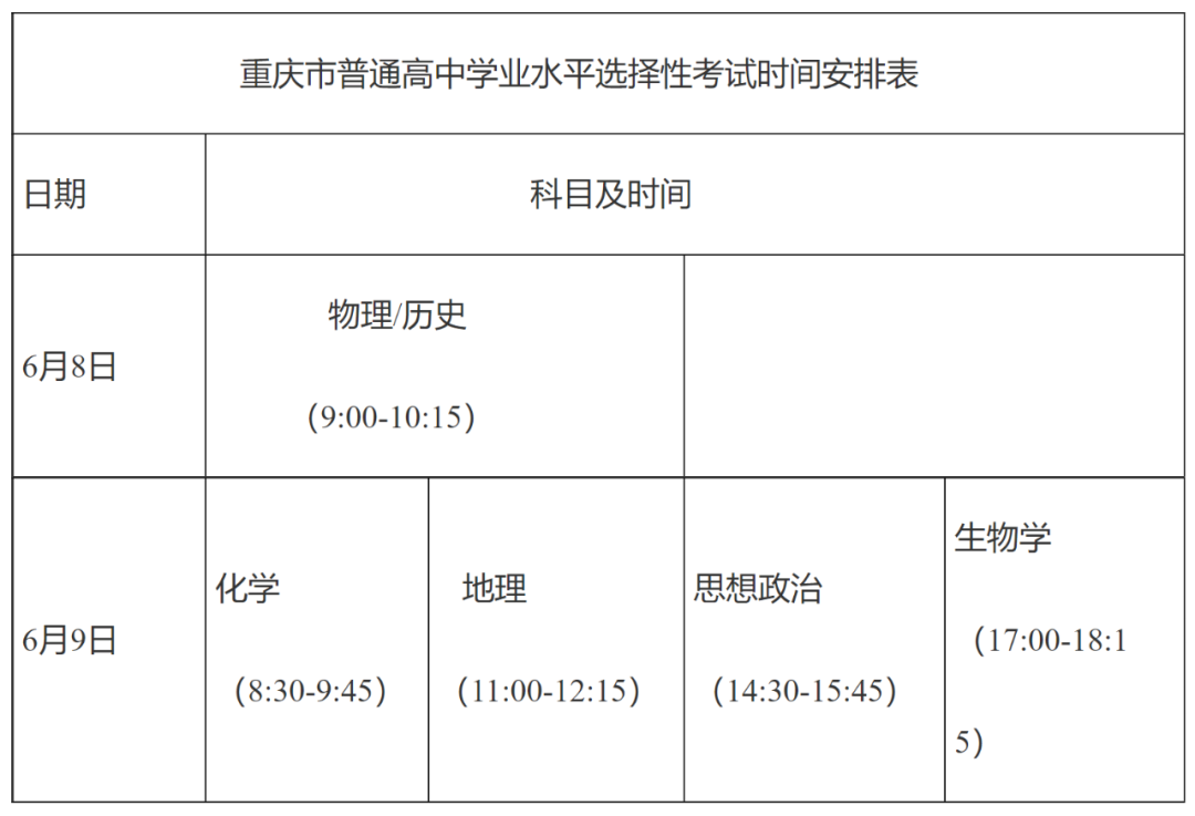 普通高中学业水平选择性考试由重庆市自主命题,由考生在物理、历史2门科目中自主选择1门,在思想政治、地理、化学、生物学4门科目中自主选择2门进行考试,考试时间安排在6月8日—9日,每科考试时间为75分钟。