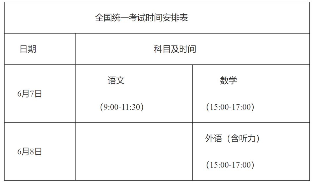 语文:6月7日上午9:00-11:30;
