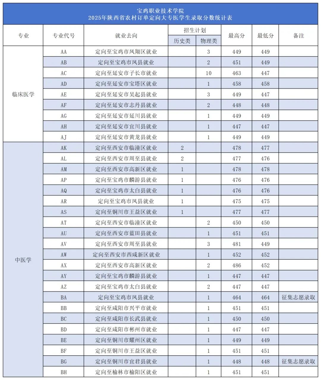 4、宝鸡职业技术学院:定向医学物理类最低449分、历史类最低475分