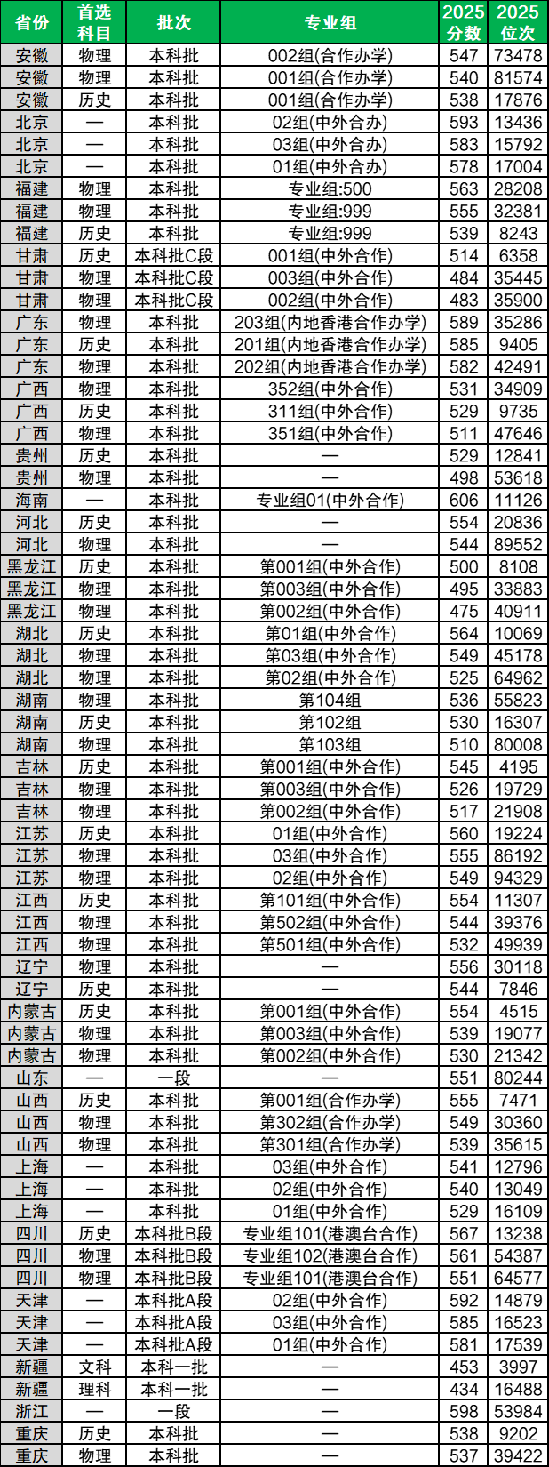 北师港浸大历年都是在旧高考省市的一本批次招生,因而该校是一本大学。以下是学校2025年在各省的录取分数线: