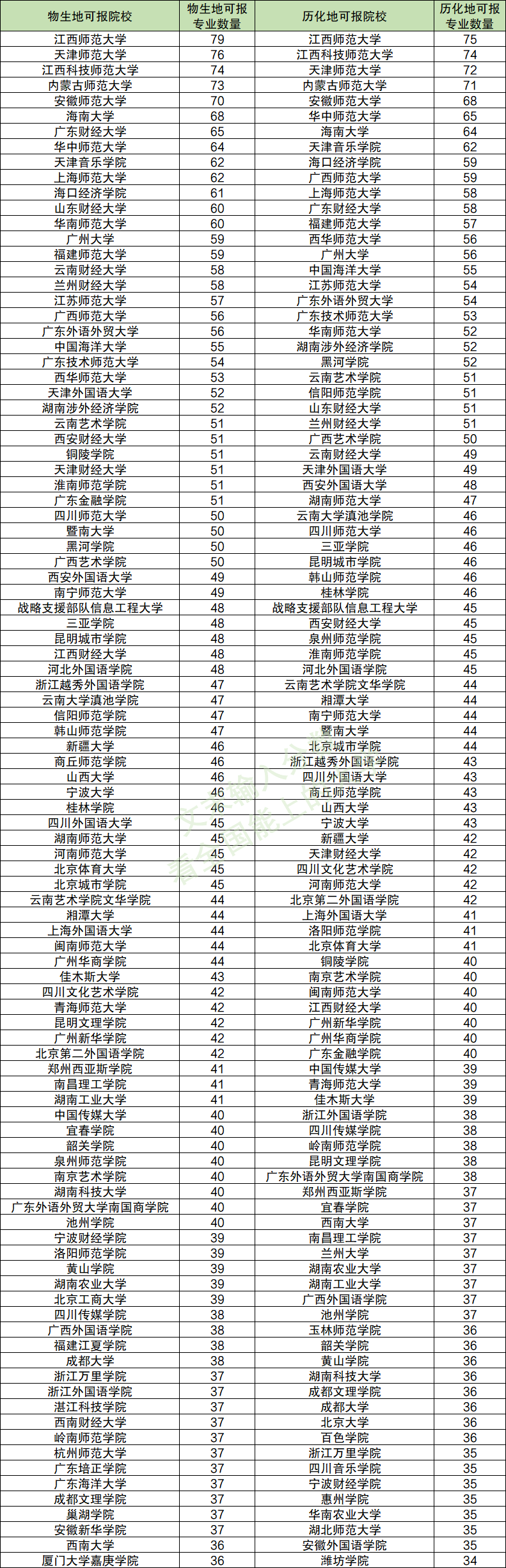 如华中师范大学物生地可报64个专业,历化地能报65个专业;华南师范大学物生地可报60个专业,历化地可报52个专业;中国海洋大学物生地可报55个专业,历化地可报55个专业等。