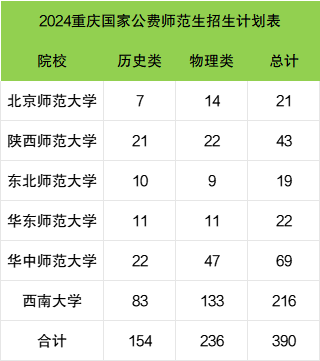 表格数据显示,共计招生390人,其中物理类236人,历史类154人。东北师范大学招生数量最少,为19人;西南大学招生数量最多,为216人。