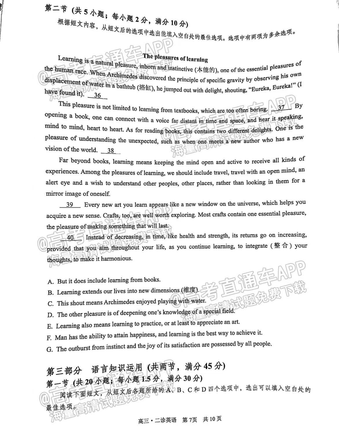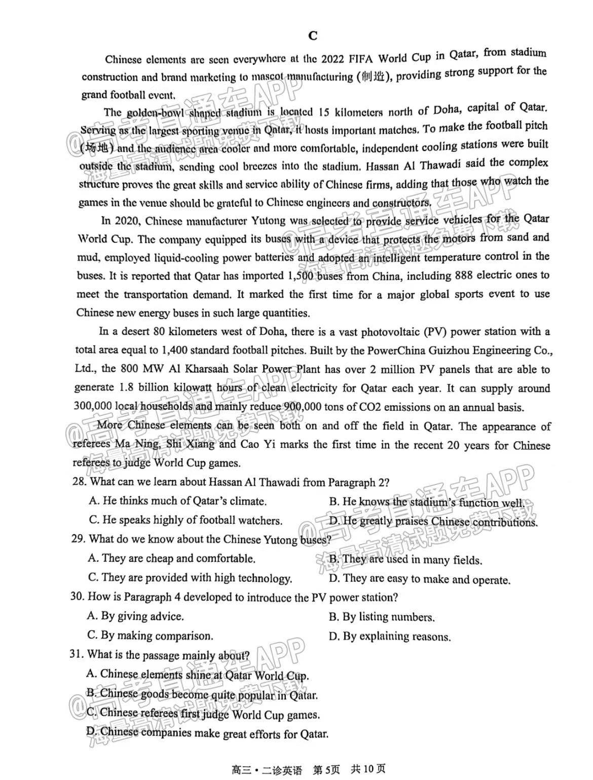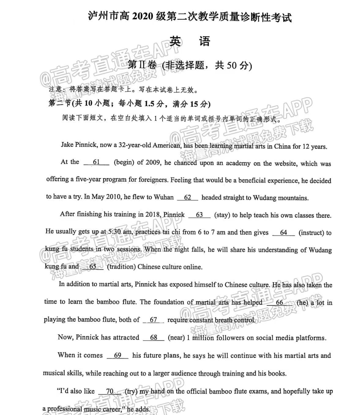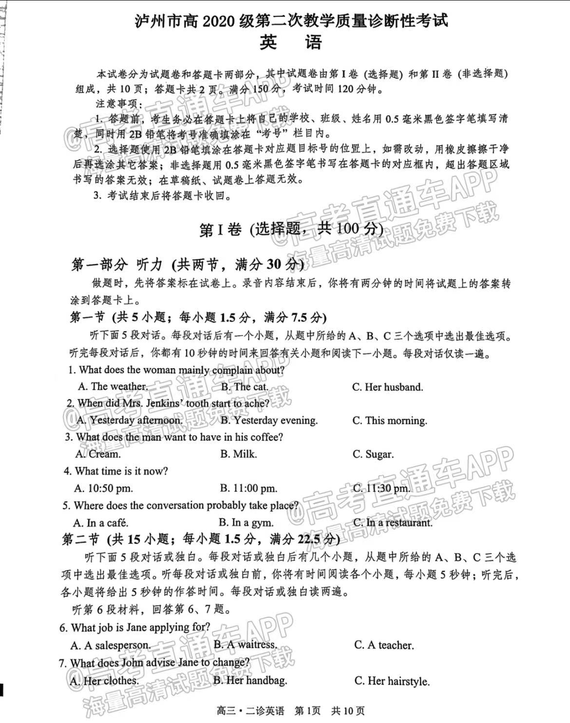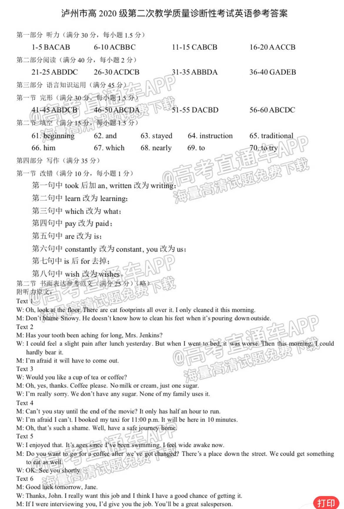 六、四川泸州二诊2023英语答案及试卷