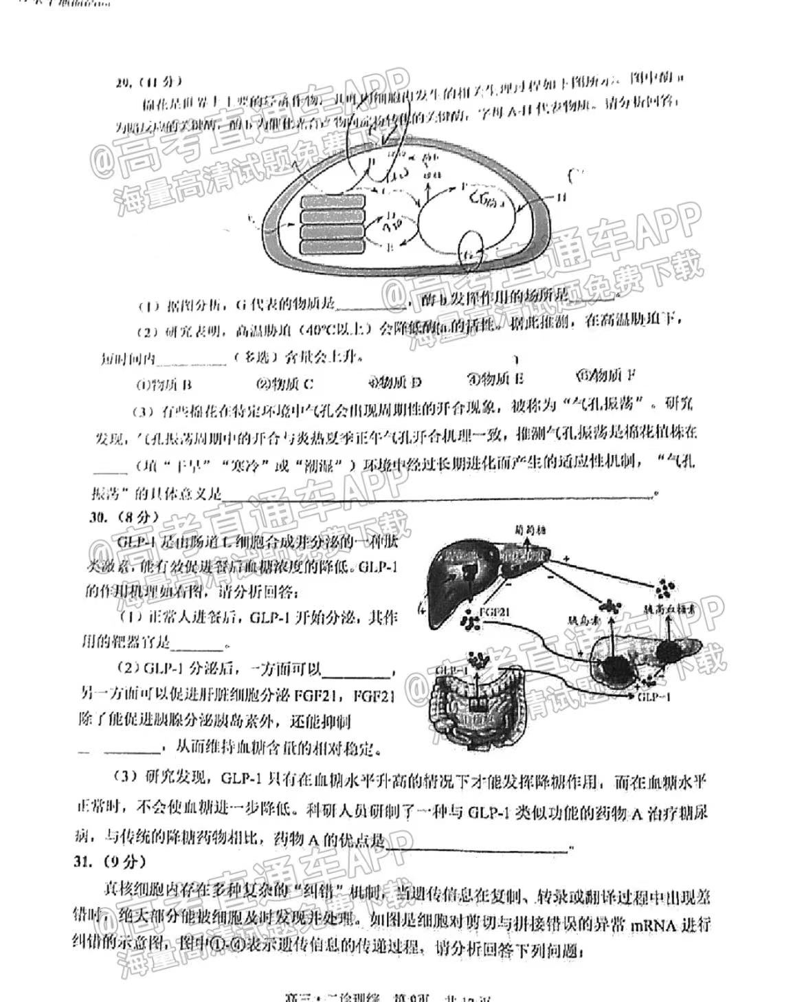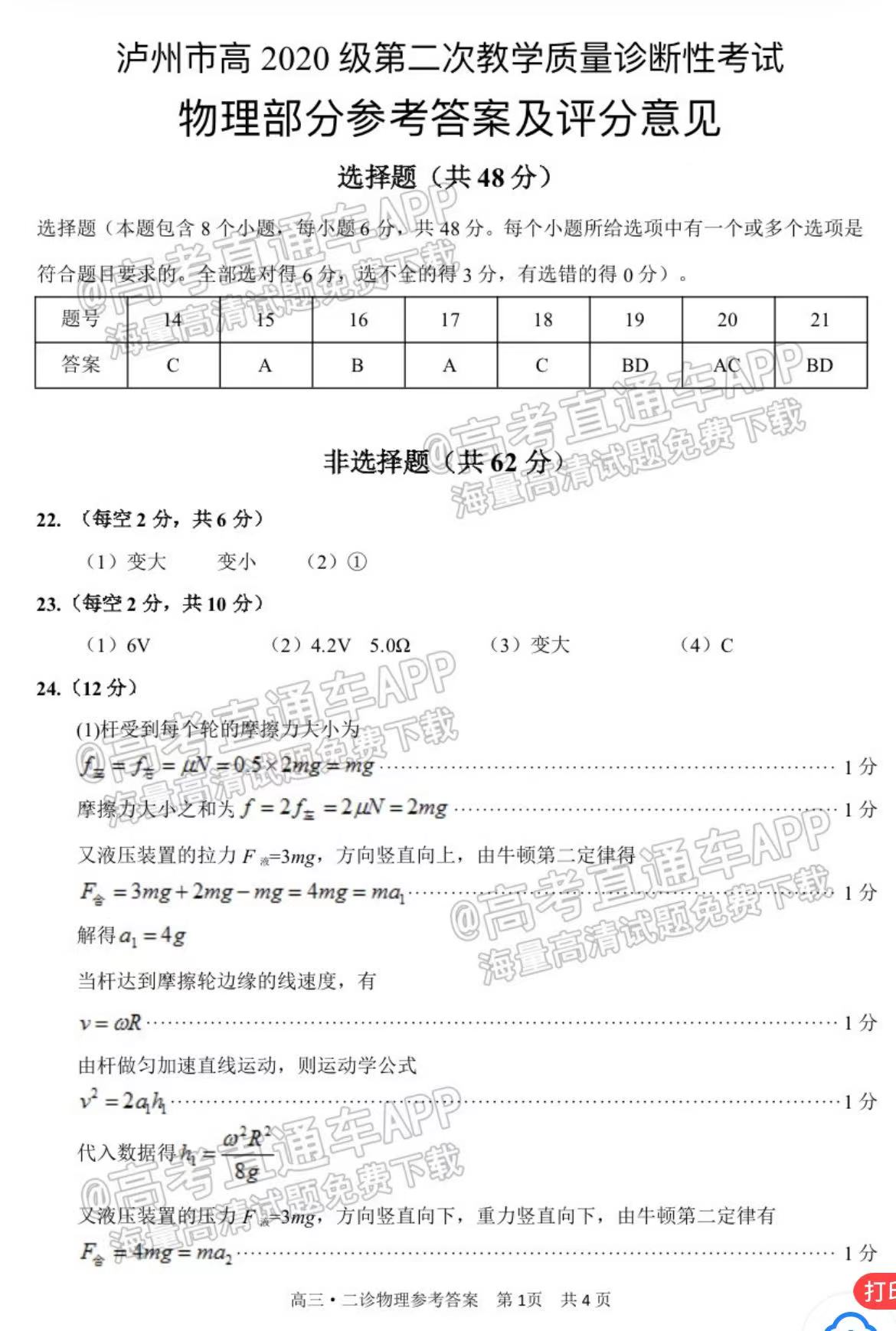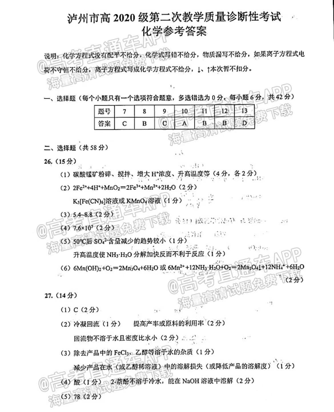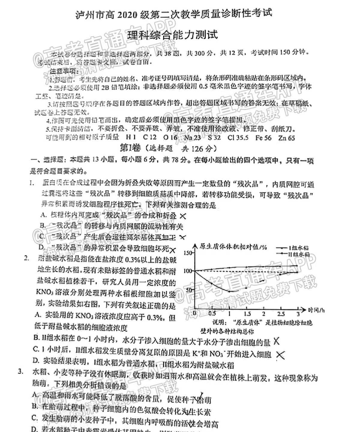 五、四川泸州二诊2023理综答案及试卷