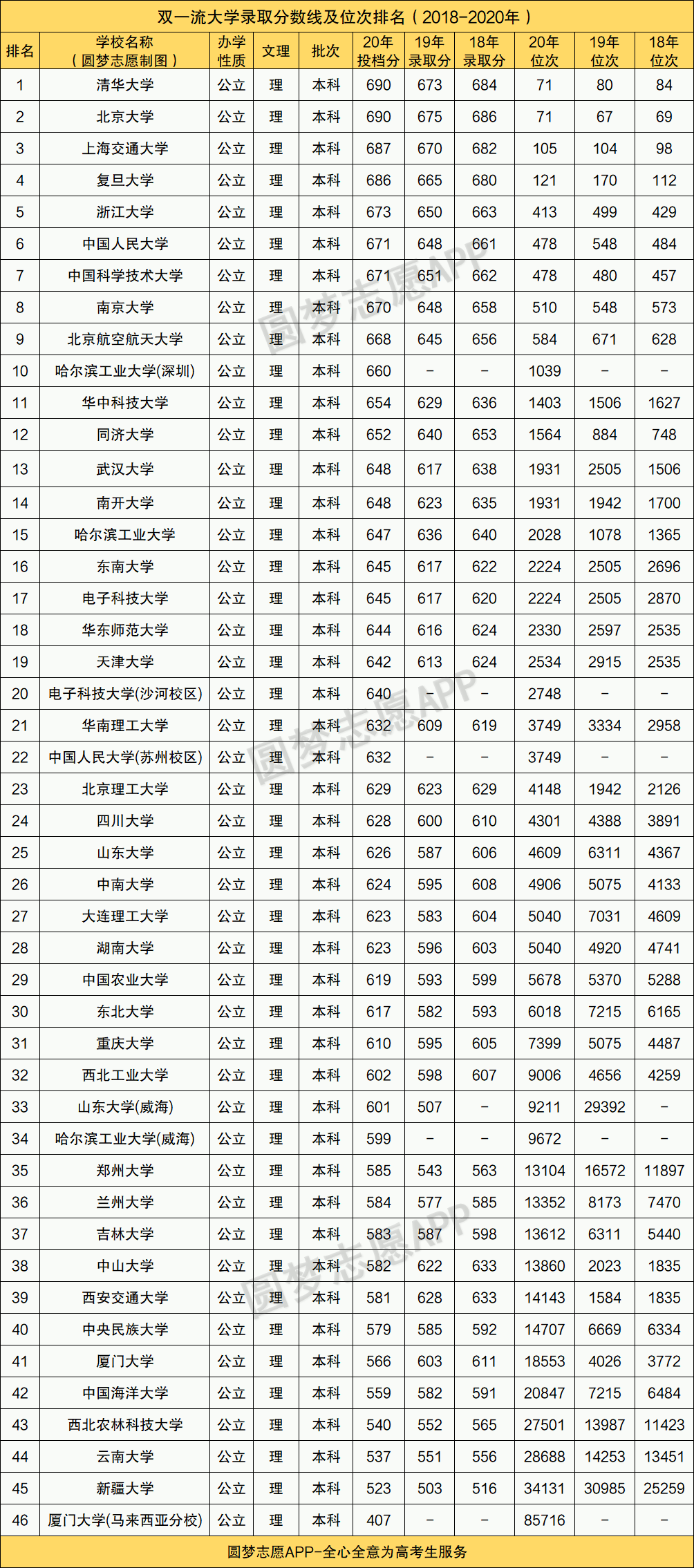收分最高的是:清华大学、北京大学,2020年投档分都为690分,位次排名都为71。