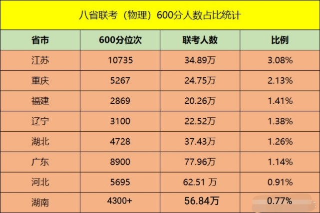 这种说法现在仿佛找到了依据,理由就是:湖南高考报名人数是56.84万人,在八省中排第三,而600分以上的人数占比只有约0.77%,还不如河北的0.91%。
