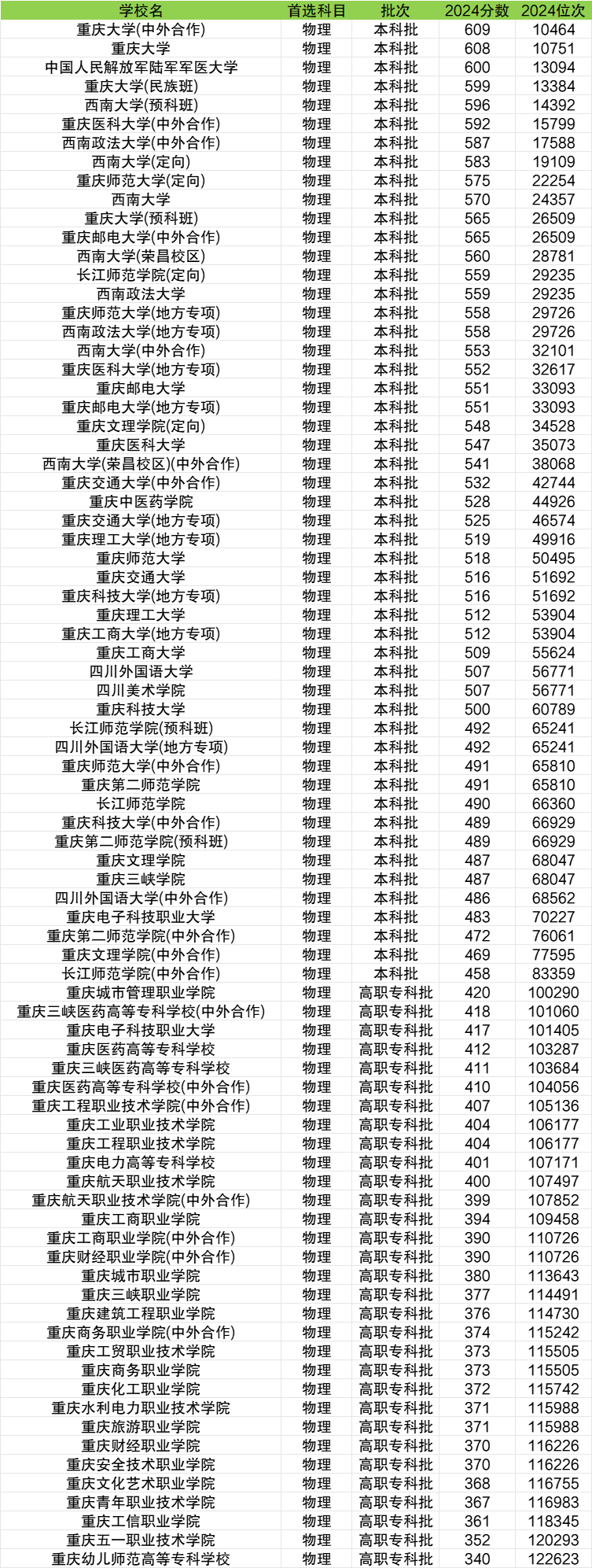 想要知道2025年该填报哪所大学,需要了解往年大学在重庆的最低录取分数线及位次情况,碍于篇幅限制,本文仅收集了2024年重庆市内公办大学招收物理类本科生的最低分数线及位次信息。