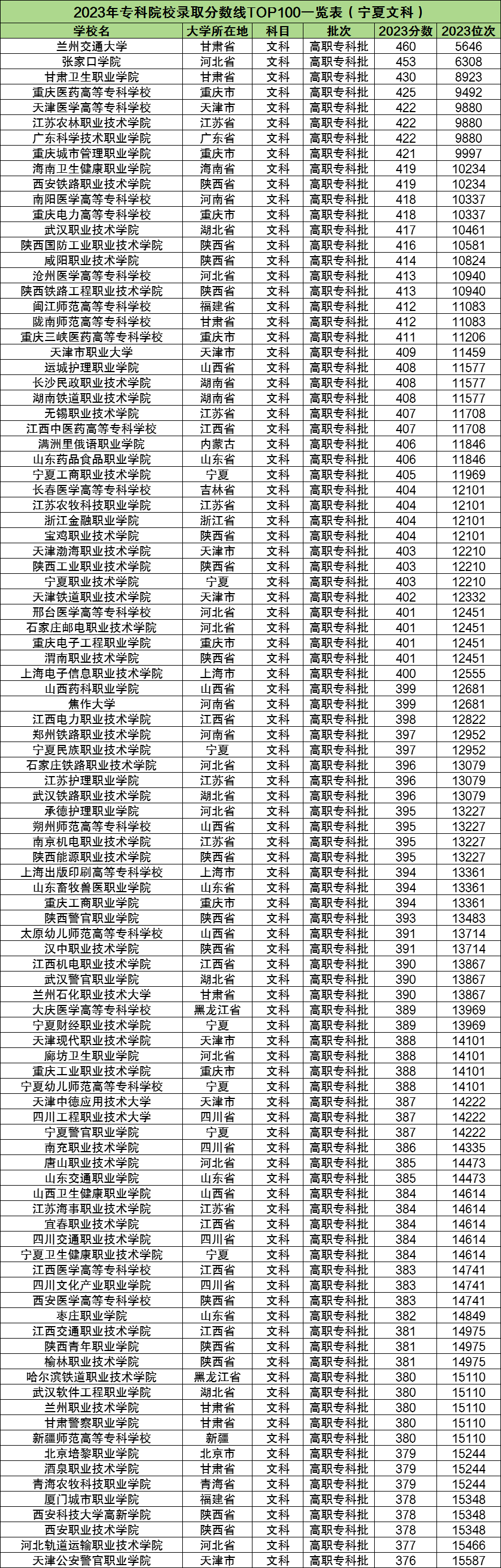 以下是2023年专科院校在宁夏文科的录取分数线TOP100一览表: