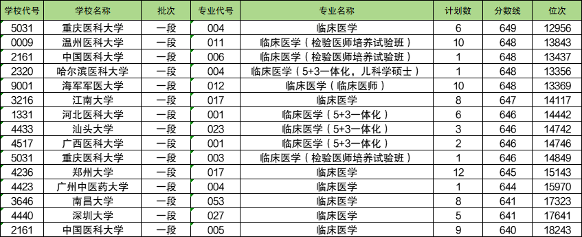 在河北省,分数线在640-650分之间的临床医学专业大学有15所,中国医科大学分数相对较低,为640分,对应全省位次18243,超过浙江省一段线148分。