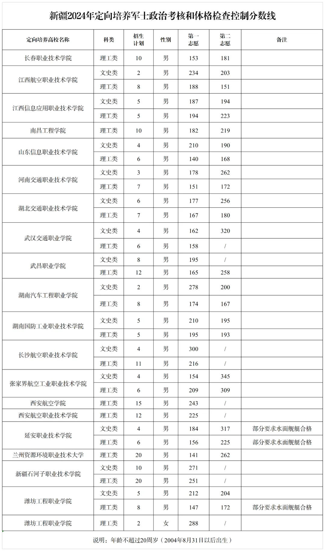 2024年在新疆招生定向培养军士共有19所学校,共招生250人,所有学校中最低需要140分才能上。
