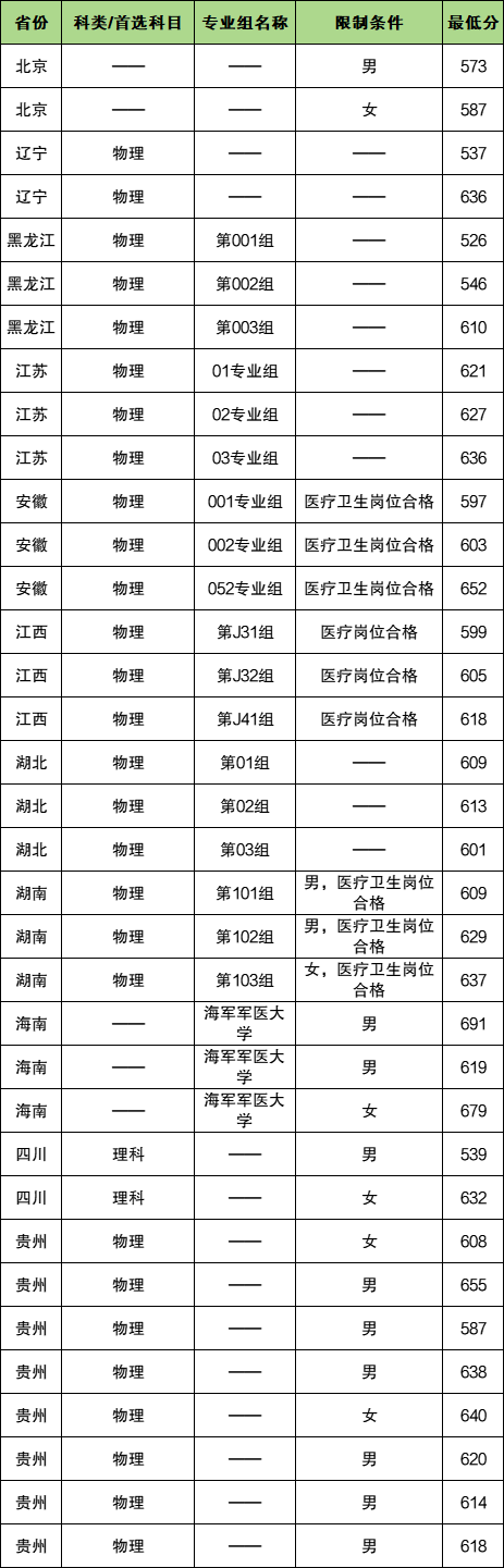 除上述省份外,其余省份上海军军医大学的最低分如下,供参考: