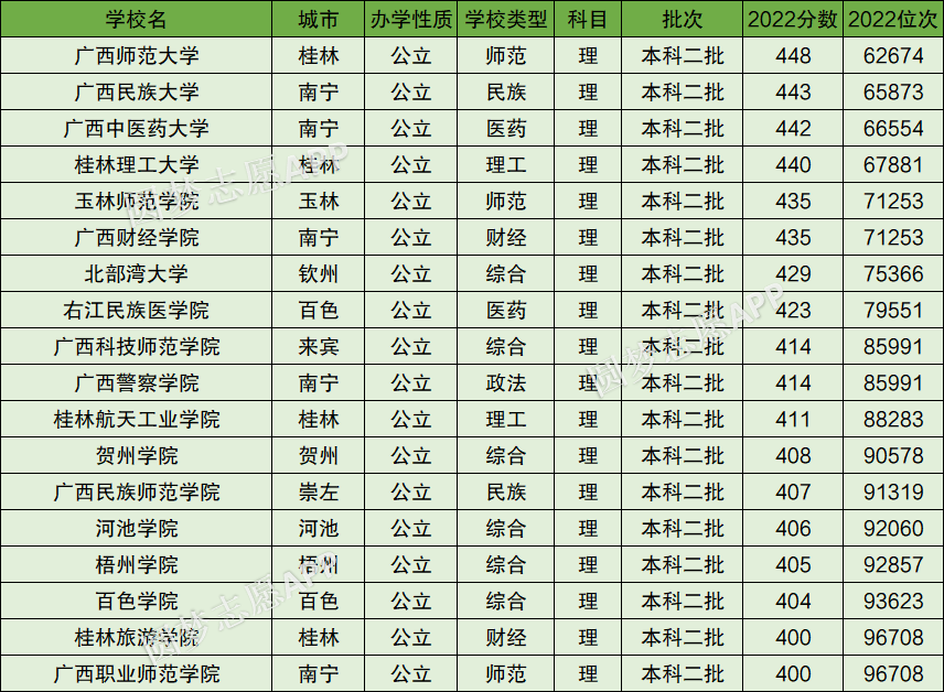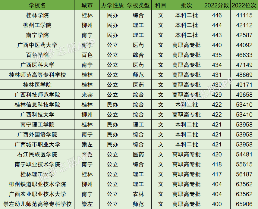 因为本文篇幅有限,不能所有大学都一一罗列,以下为2022年广西壮族自治区内文科分数线在400~450分的大学名单。