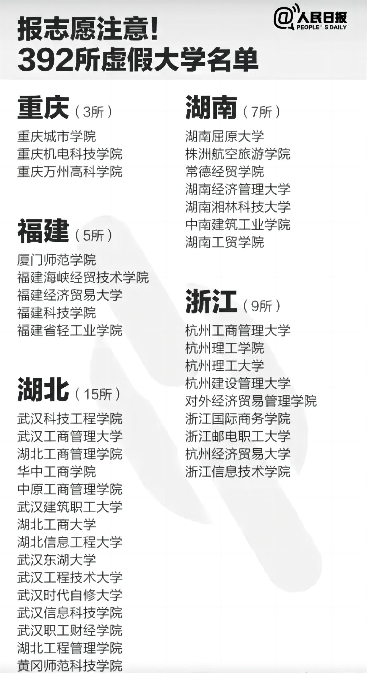 这些垃圾大学通常没有官网、没有录取分数线,甚至没有办学地址和师资,而且招生方式几乎毫无门槛、交钱就可以上,更可恶的是这些垃圾大学还打着正规大学的旗号坑蒙拐骗,骗取家长和考生的钱财,最终毕业证书没有任何价值,如同废纸。那么上文为大家介绍了湖南十大垃圾专科学校,希望大家避雷,不要听信任何捡漏上大学的话术,填报志愿时一定要避开这些垃圾大学,避免上当受骗。下图为人民日报整理的湖南省最垃圾的野鸡大学名单,供大家参考: