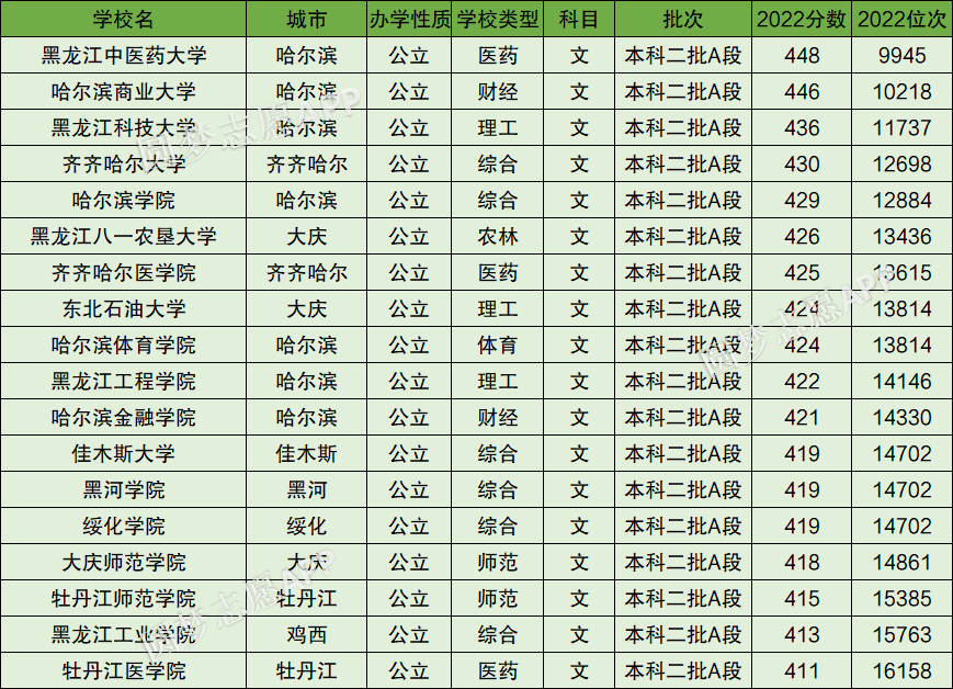 因为本文篇幅有限,不能所有大学都一一罗列,以下为2022年黑龙江省内文科分数线在400~450分的大学名单。