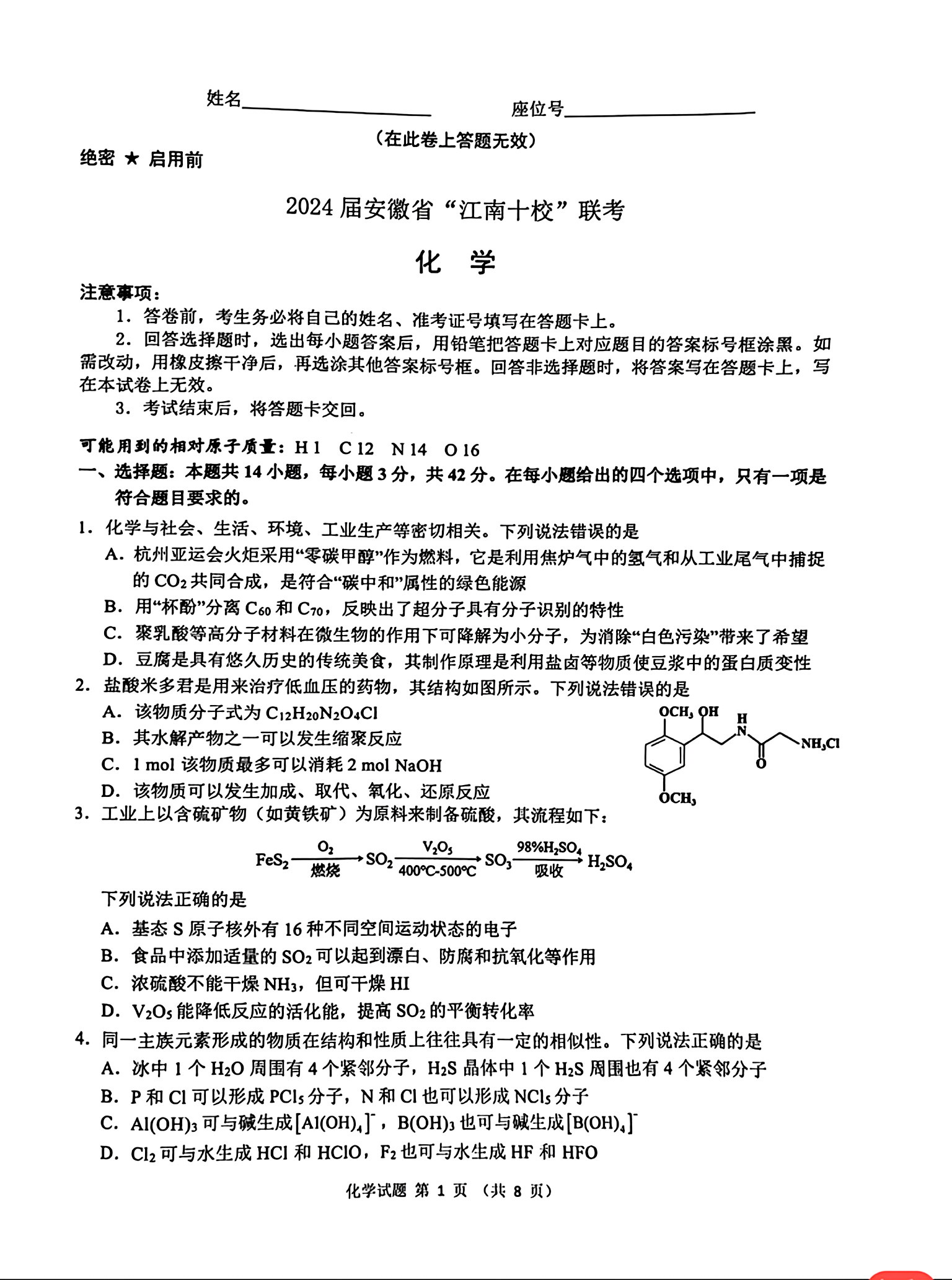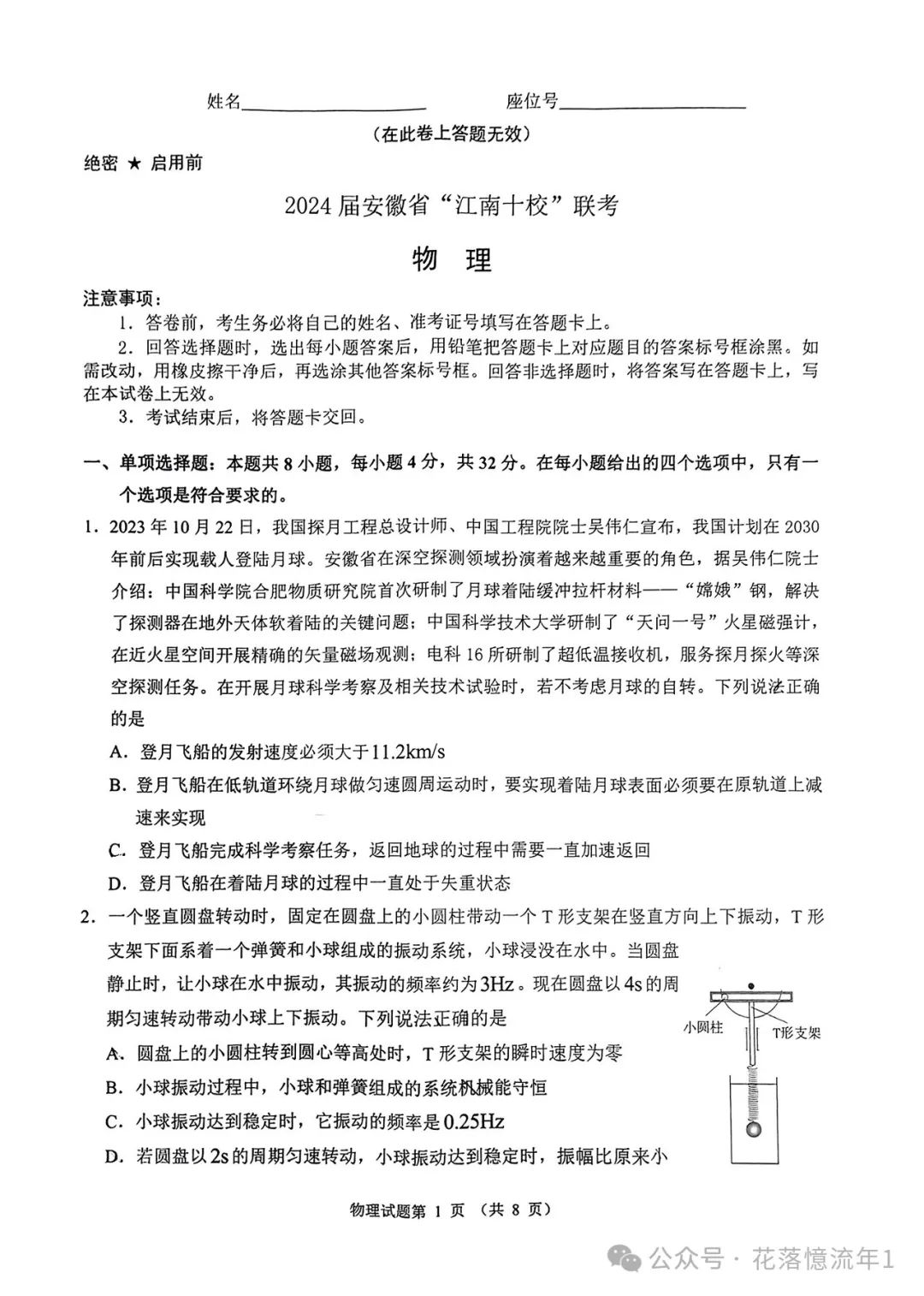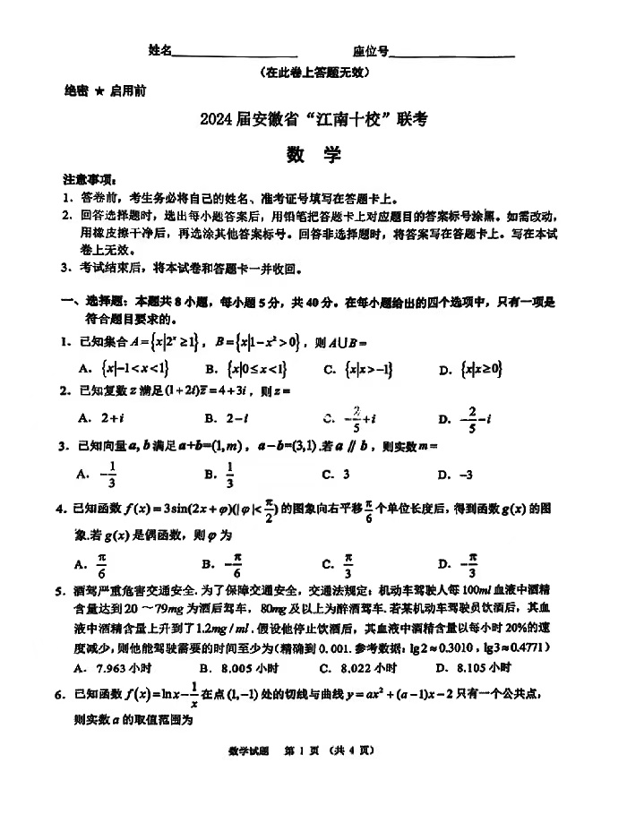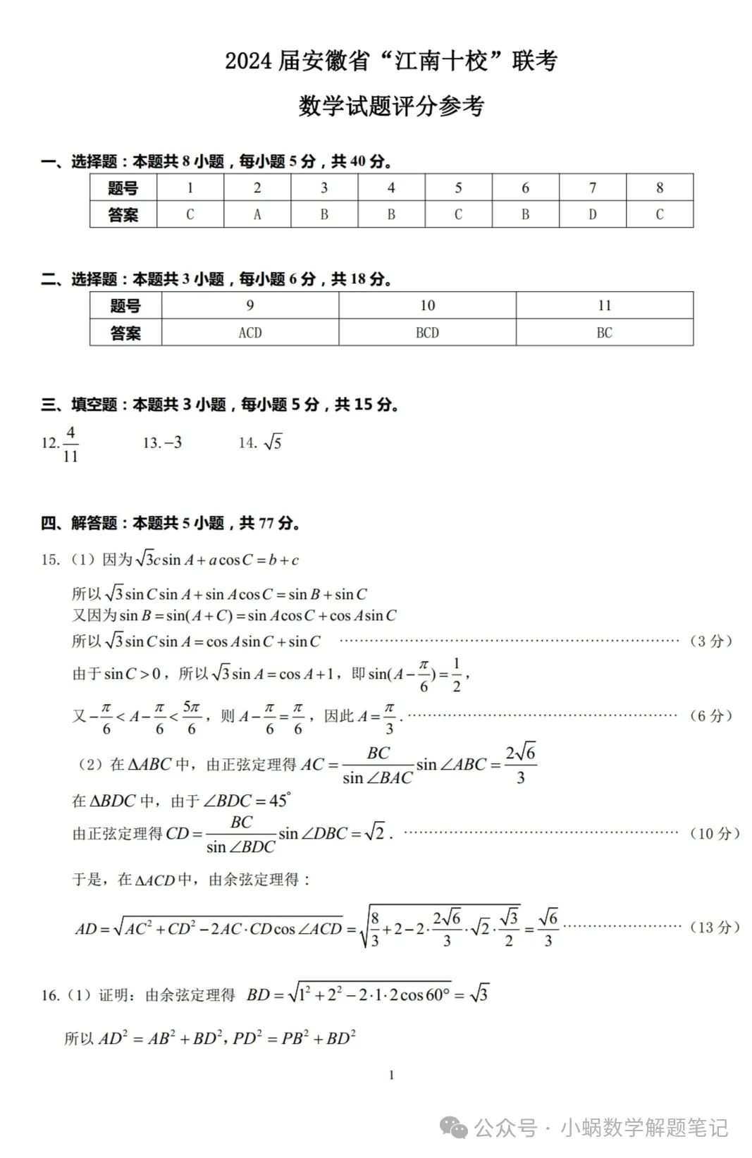 以下为2024江南十校一模3月联考各科试卷及答案解析汇总: