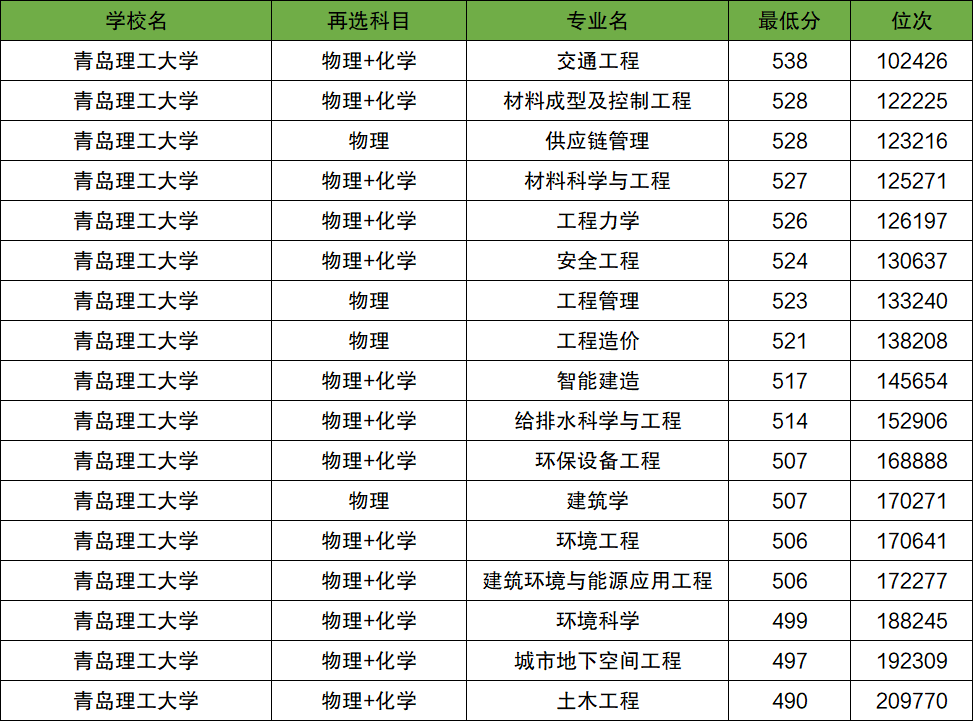 4、青岛理工大学:最低分数线是土木工程专业的490分。