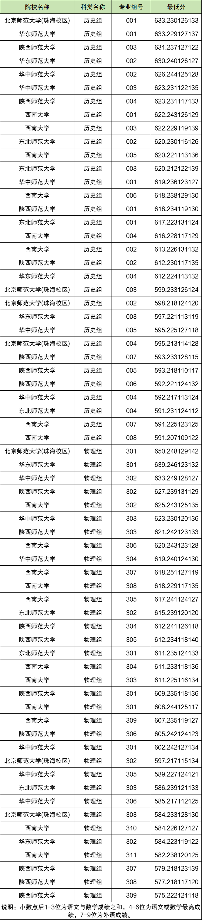 分数线最低、最好考院校专业组:历史类为西南大学008专业组(591分);物理类为陕西师范大学309专业组(575分)。