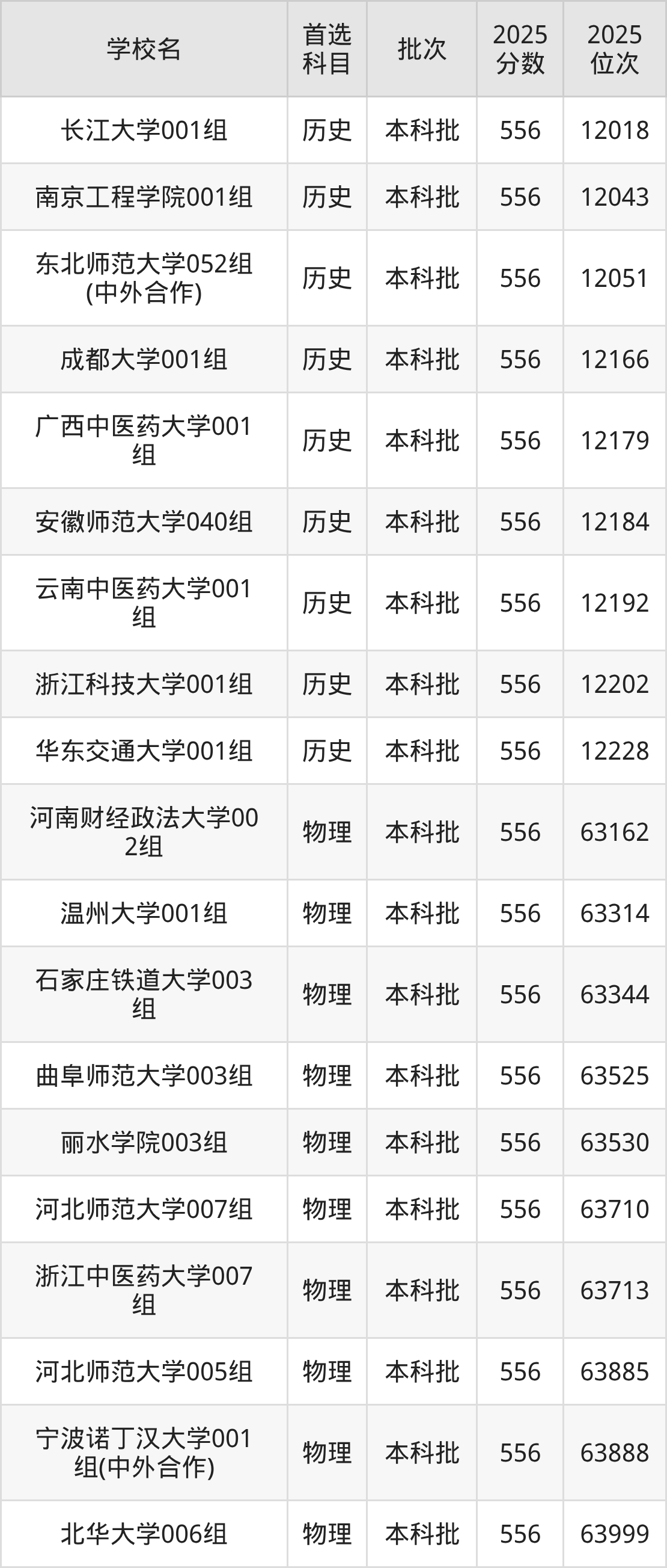历史类556分能上的有长江大学、南京工程学院、东北师范大学、成都大学、广西中医药大学等;物理类556分能上的有河南财经政法大学、温州大学、石家庄铁道大学、曲阜师范大学、丽水学院等。