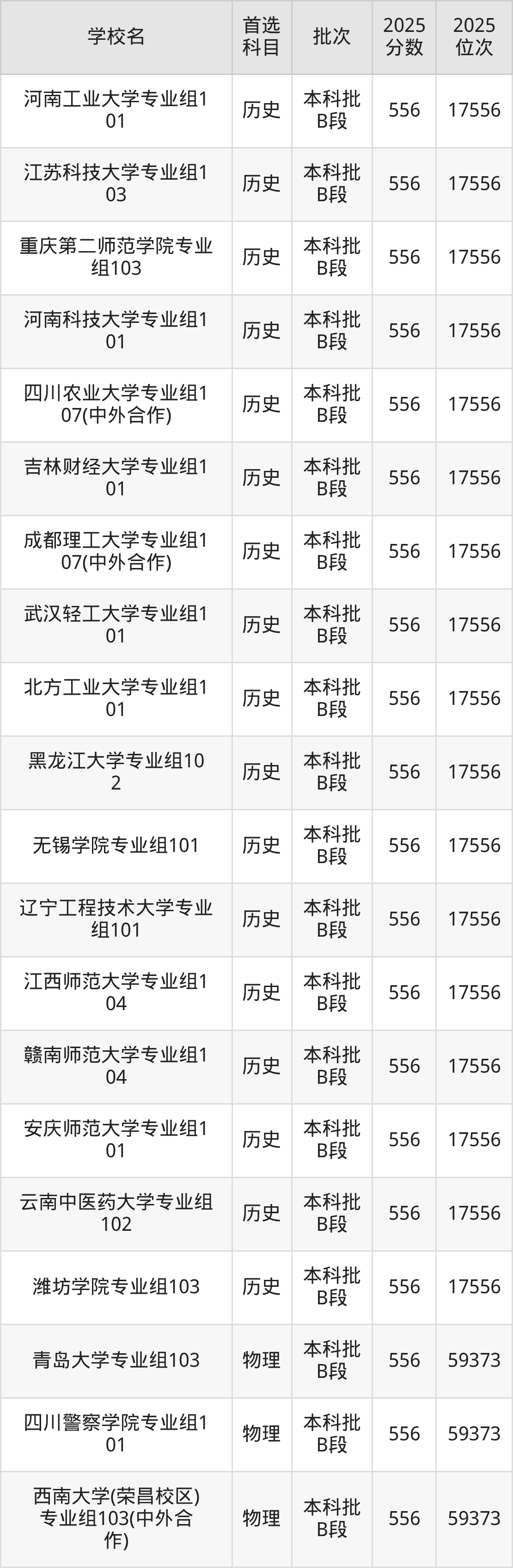 历史类556分能上的有河南工业大学、江苏科技大学、重庆第二师范学院、河南科技大学、四川农业大学等;物理类556分能上的有青岛大学、四川警察学院、西南大学(荣昌校区)、浙江师范大学、成都大学等。