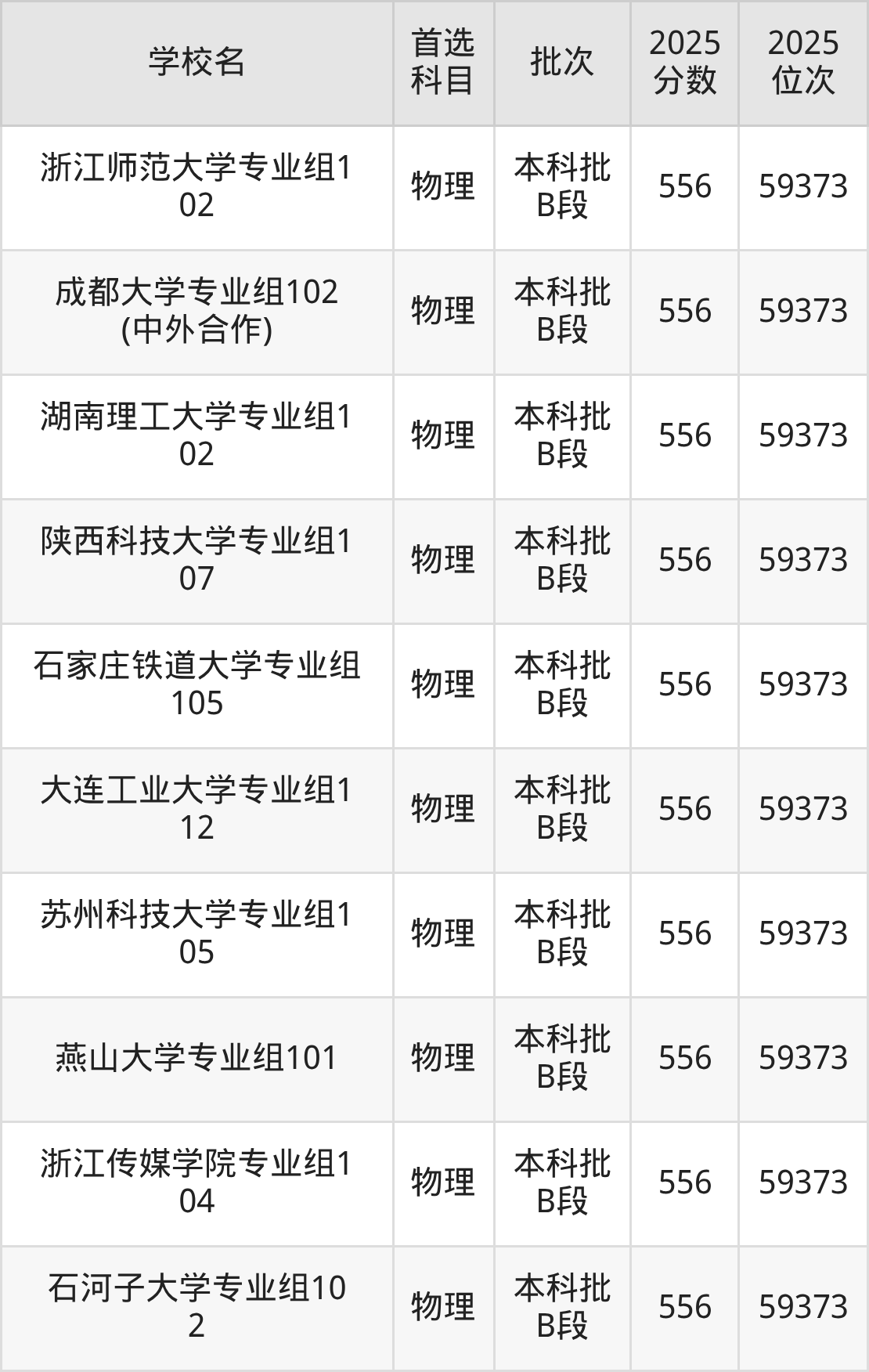 2025年浙江556分对应排名:104444名~105089名,因此建议2026年高考位次在10.5万名左右的考生报考这些学校。
