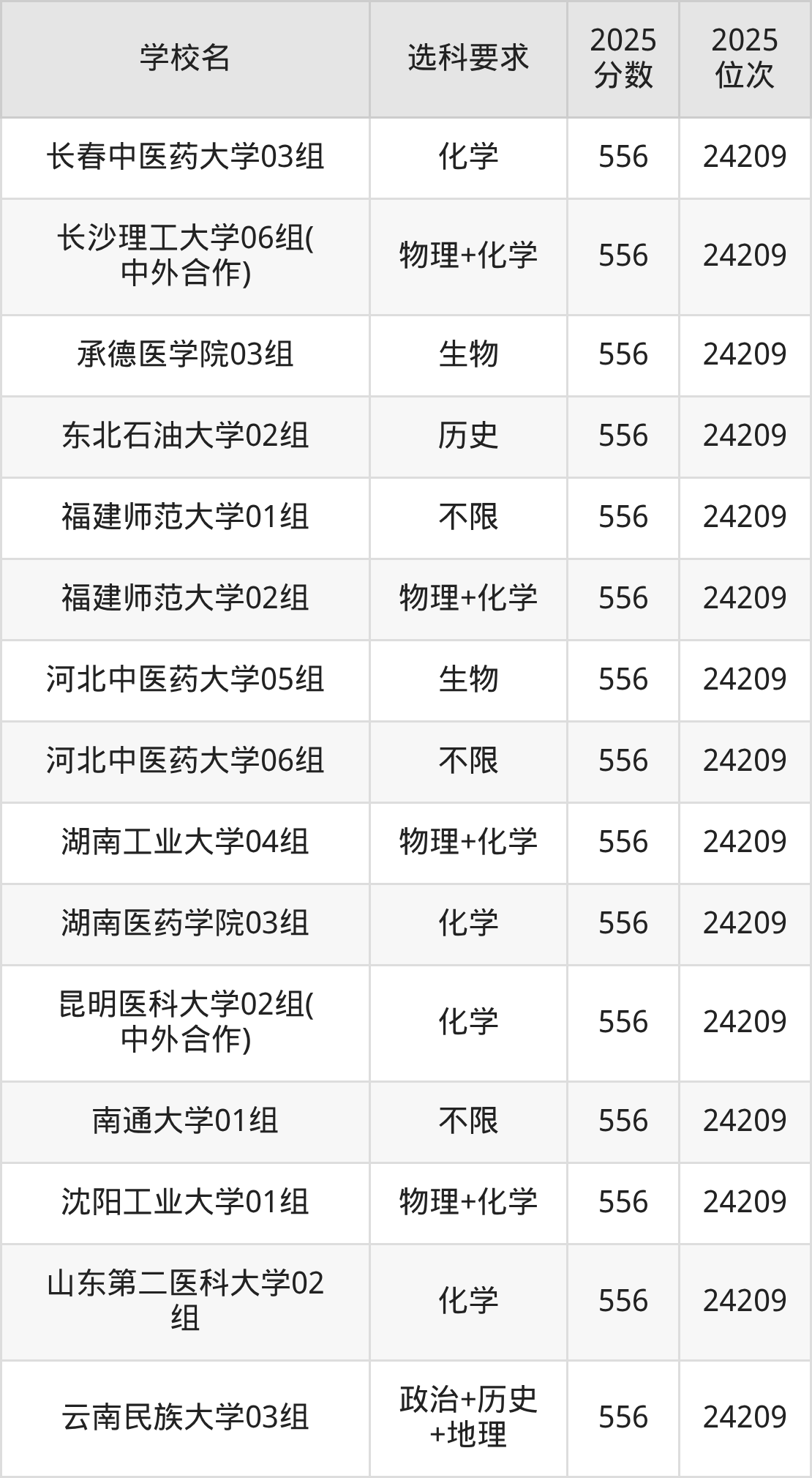 选科化学的考生556分能上的大学有长春中医药大学、湖南医药学院、昆明医科大学、山东第二医科大学;选科物理+化学的考生556分能上的大学有长沙理工大学、福建师范大学、湖南工业大学、沈阳工业大学;选科生物的考生556分能上的大学有承德医学院、河北中医药大学;选科历史的考生556分能上的大学有东北石油大学;556分“不限选科要求”的大学是福建师范大学、河北中医药大学、南通大学;选科政治+历史+地理的考生556分能上的大学有云南民族大学。