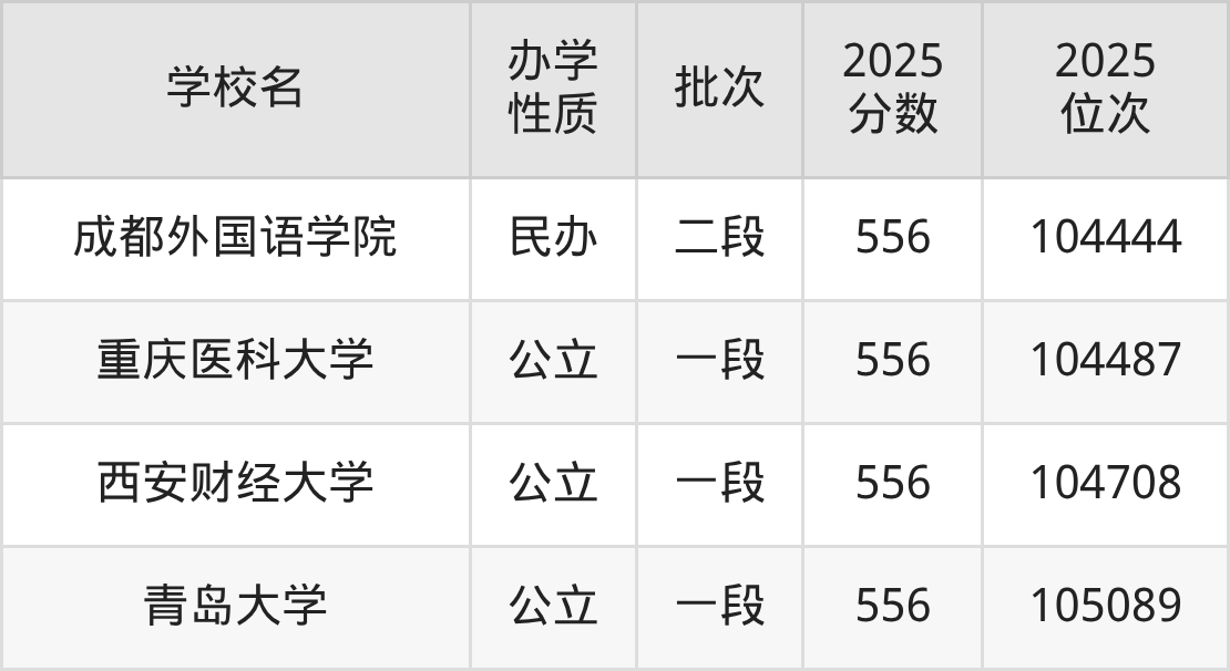 556分能上的大学中:公办的有重庆医科大学、西安财经大学、青岛大学;民办的有成都外国语学院。