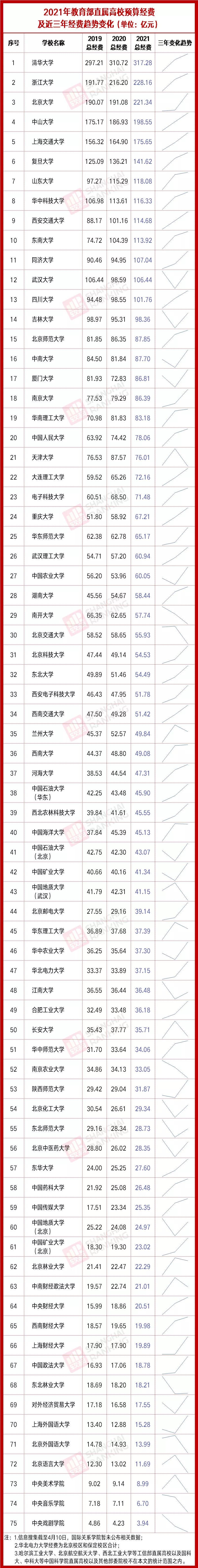 由于篇幅有限,文章仅展示2021年教育部直属高校(国际关系学院除外)的财政拨款及近三年经费趋势变化,详见下图: