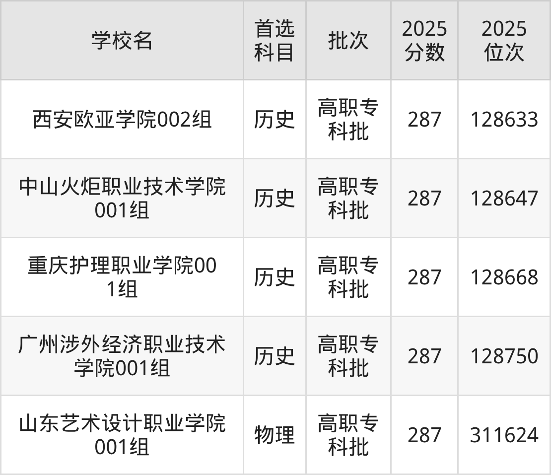 历史类287分能上的有西安欧亚学院、中山火炬职业技术学院、重庆护理职业学院、广州涉外经济职业技术学院;物理类287分能上的有山东艺术设计职业学院。