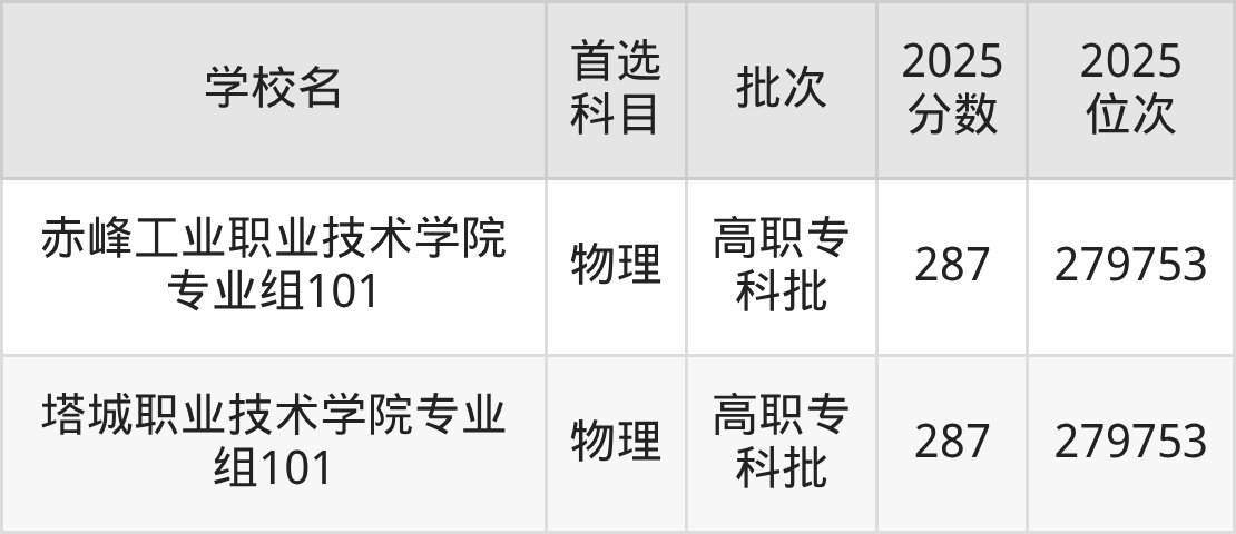 物理类287分能上的有赤峰工业职业技术学院、塔城职业技术学院。