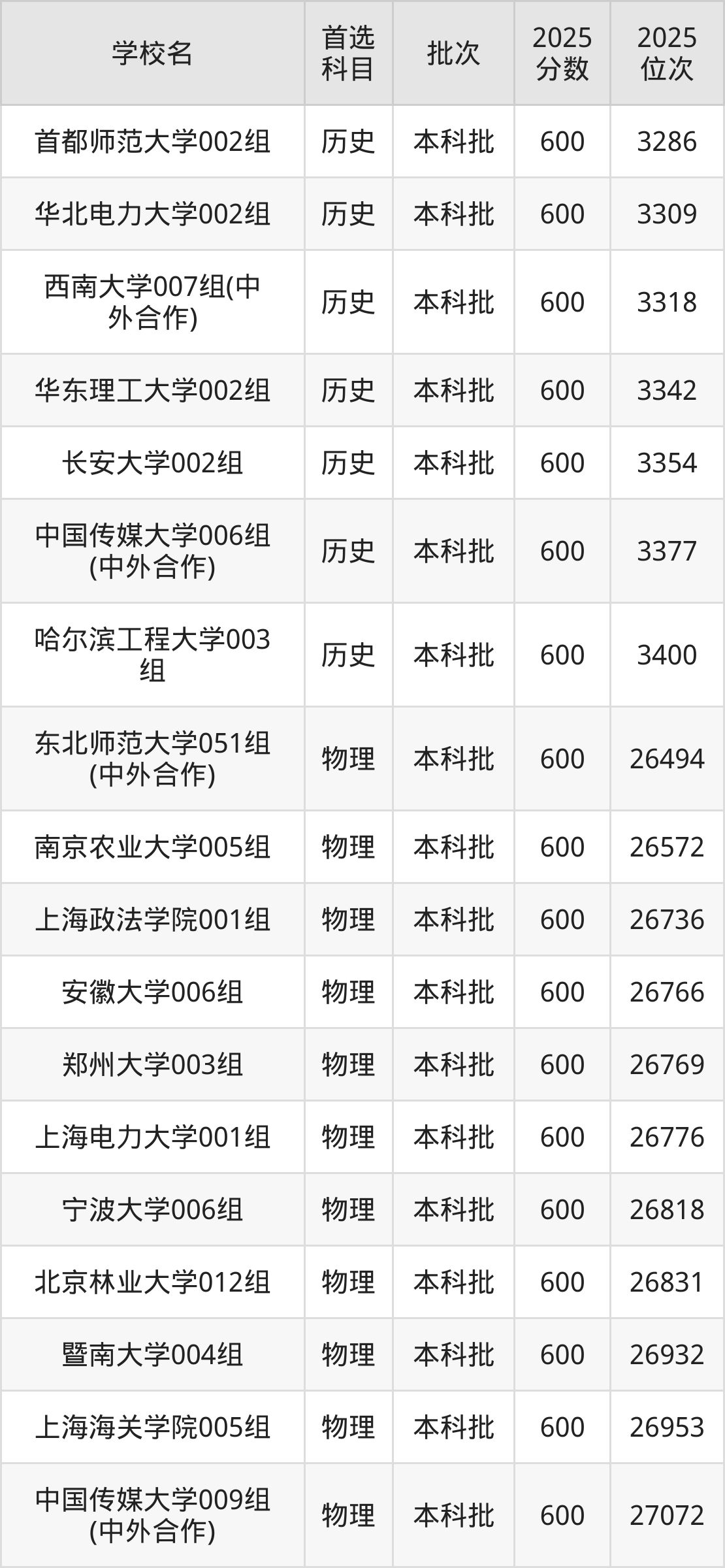 历史类600分能上的有首都师范大学、华北电力大学、西南大学、华东理工大学、长安大学等;物理类600分能上的有东北师范大学、南京农业大学、上海政法学院、安徽大学、郑州大学等。