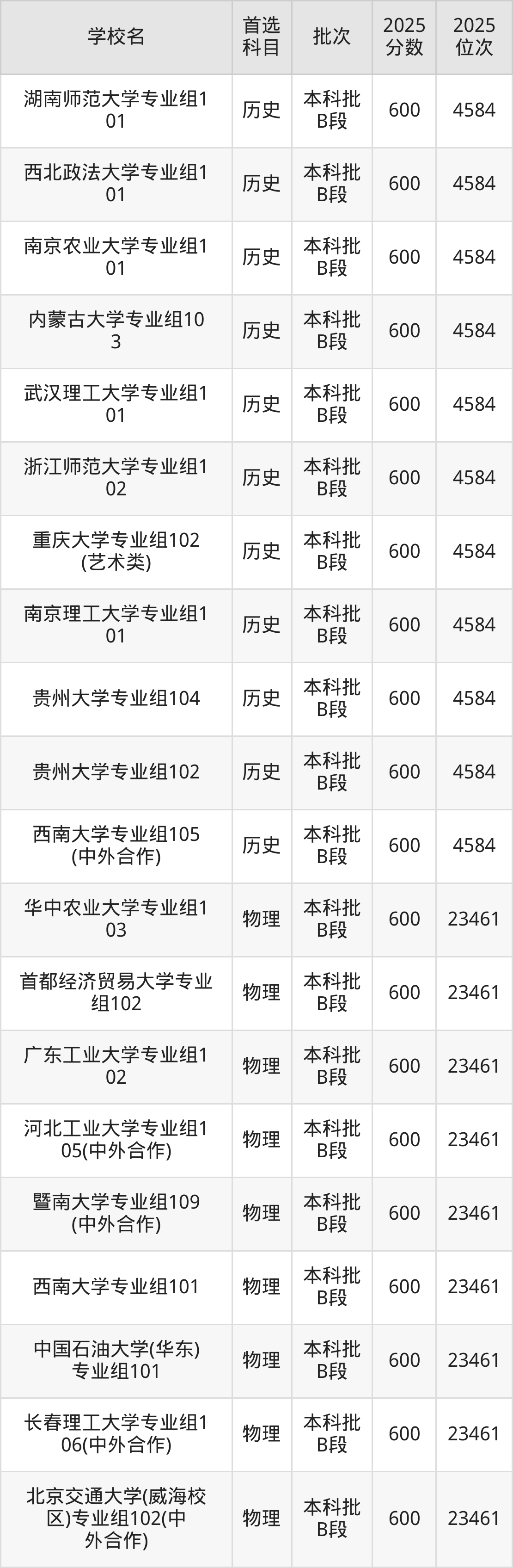 历史类600分能上的有湖南师范大学、西北政法大学、南京农业大学、内蒙古大学、武汉理工大学等;物理类600分能上的有华中农业大学、首都经济贸易大学、广东工业大学、河北工业大学、暨南大学等。