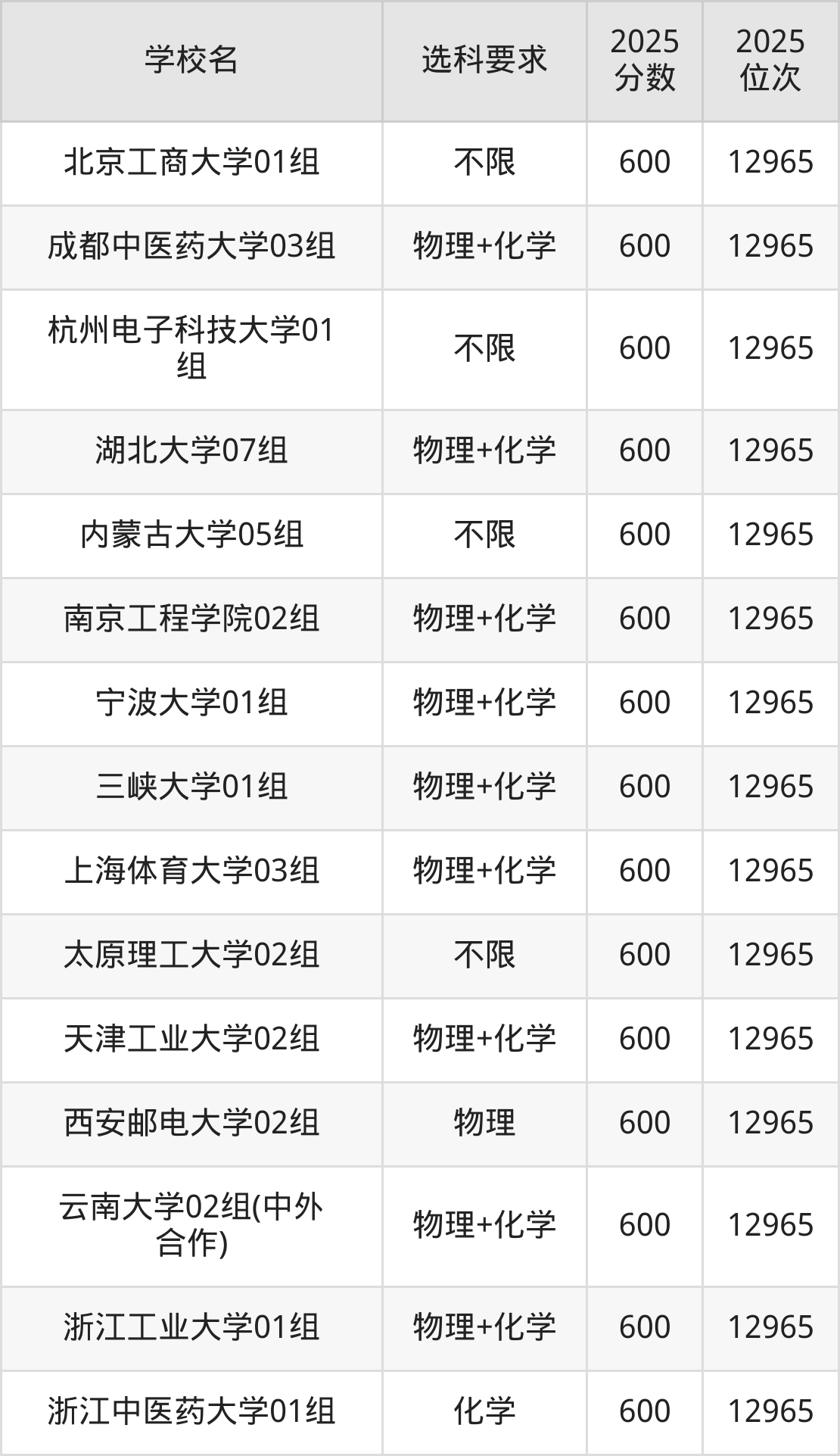 600分“不限选科要求”的大学是北京工商大学、杭州电子科技大学、内蒙古大学、太原理工大学;选科物理+化学的考生600分能上的大学有成都中医药大学、湖北大学、南京工程学院、宁波大学、三峡大学;选科物理的考生600分能上的大学有西安邮电大学;选科化学的考生600分能上的大学有浙江中医药大学。