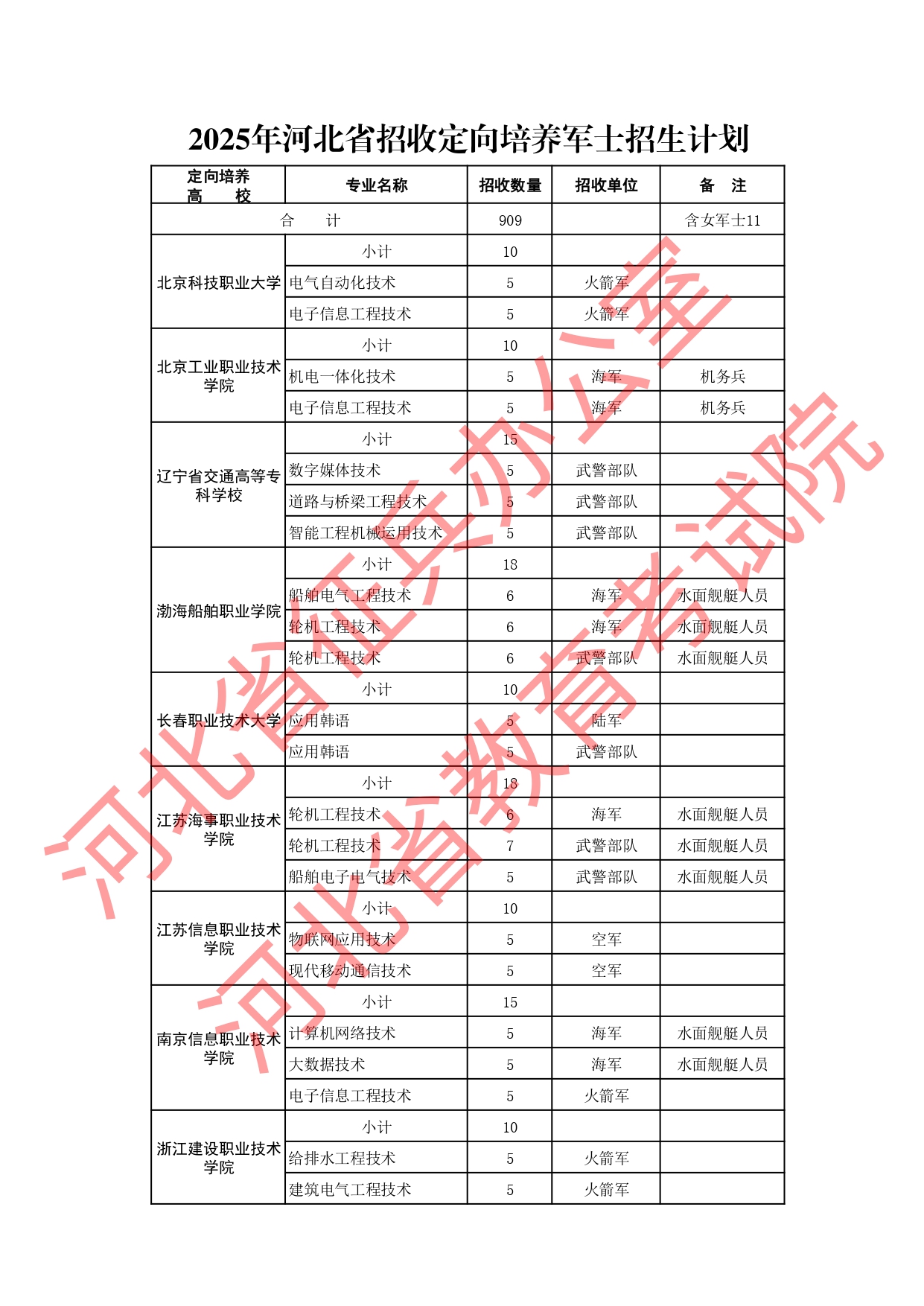 2025年河北省定向士官招生计划数共计909人,较2024年减少了89人,其中女生招11人。