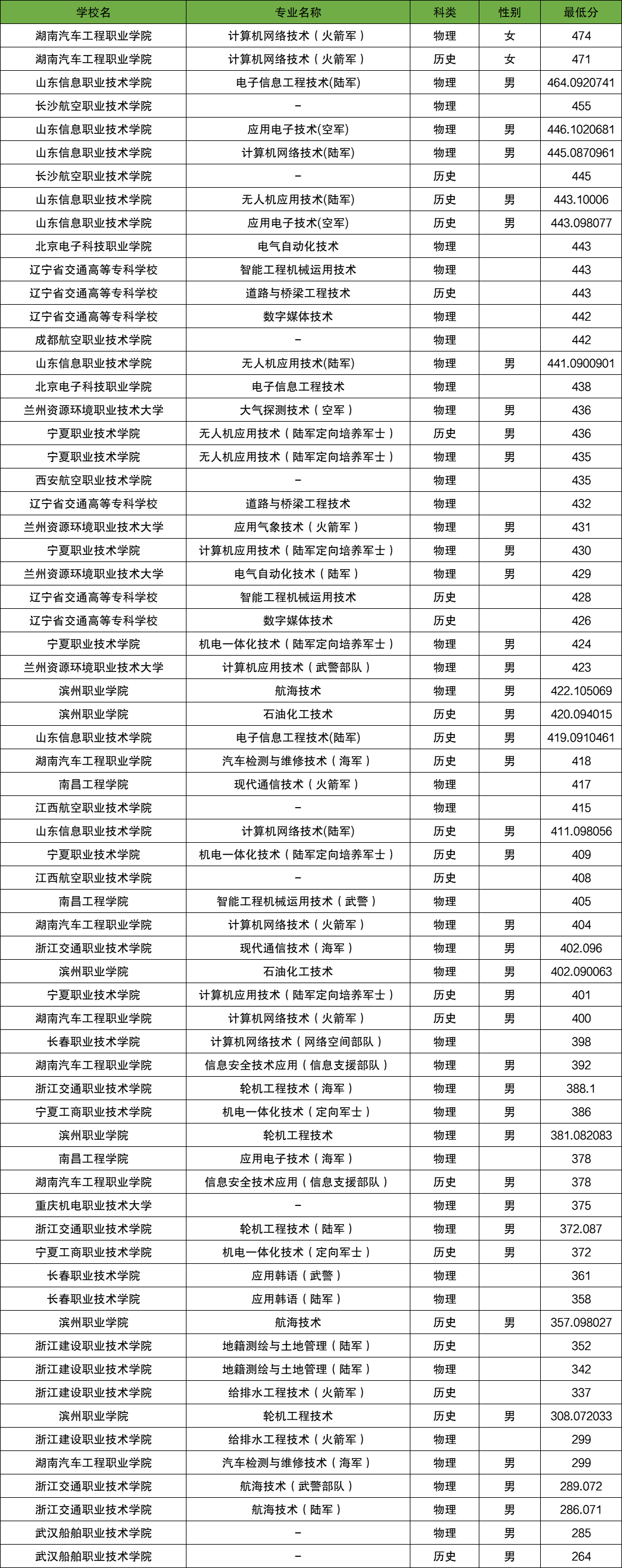 浙江建设职业技术学院,最低分数线为337分,招生专业为给排水工程技术(火箭军)。