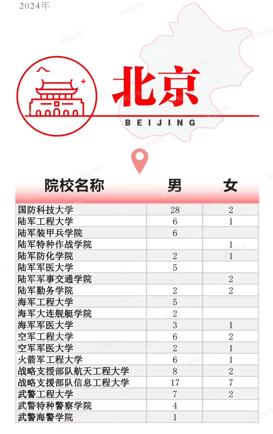 2024年在北京市招生的军校中国防科技大学共招生30人、陆军工程大学共招生7人、陆军装甲兵学院共招生6人。本期将介绍2024年全国各军校在北京的招生人数,包括男生、女生各招多少人。