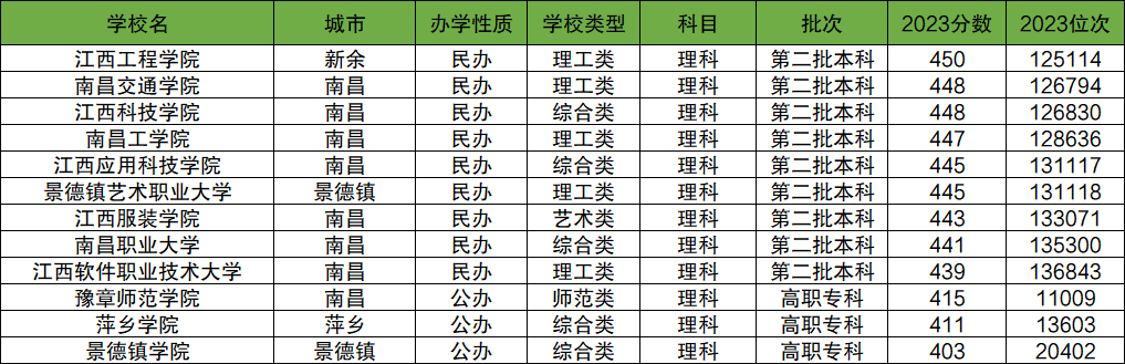因为本文篇幅有限,不能所有大学都一一罗列,以下为2023年江西省内文科分数线在400~450分的大学名单。