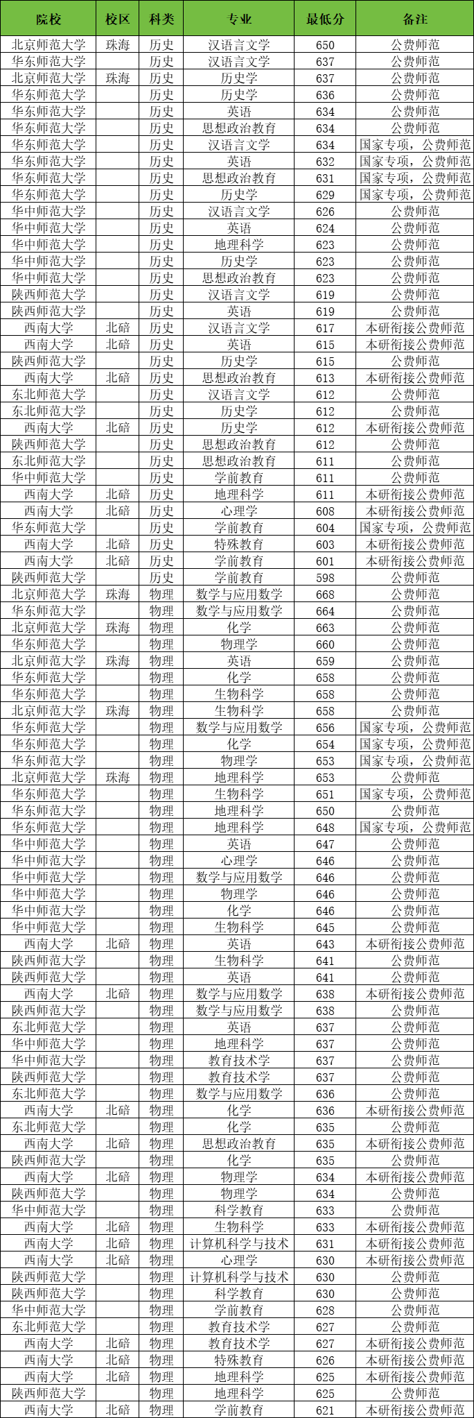 最低分的公费师范生院校及专业是西南大学的学前教育专业,录取分数线为621分。