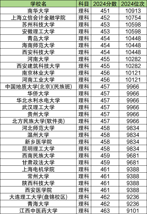 位次在10000左右的基本属于211或省重点院校,分数在451-463分之间,比一本线高19-31分之间。其中位次相对靠后的有南华大学、上海立信会计金融学院、苏州科技大学、安徽理工大学、青岛大学。