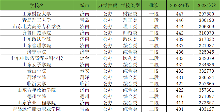 因为本文篇幅有限,不能所有大学都一一罗列,以下为2023年山东省内分数线在400~450分的大学名单。