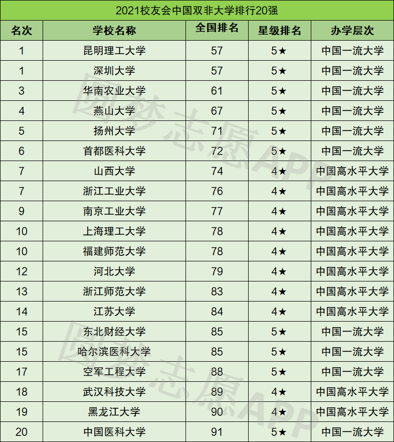 在20前榜单中,昆明理工大学与深圳大学同时并列第一名,而中国医科大学位列于前20中的第20位,整体来看,以上双非院校实力都不容小觑,且都是我国以后发展的重要院校,如果有关注学校的同学,不妨打开手机下载圆梦志愿APP,查询一下自己能上这些学校的可能性。最后,祝愿所有参与高考的学子们,高考顺利。