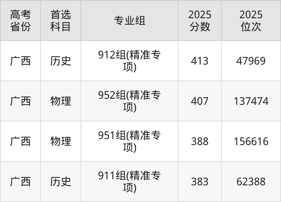 以2025年广西高考为例,柳州铁道职业技术学院精准专项历史类的最低分是383分、普通高职高专批历史类的最低分是415分。与普通高职高专批相比,精准专项的最低分降低了2分。