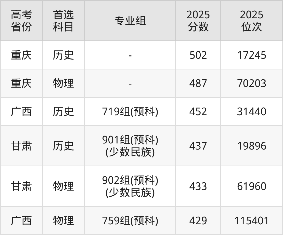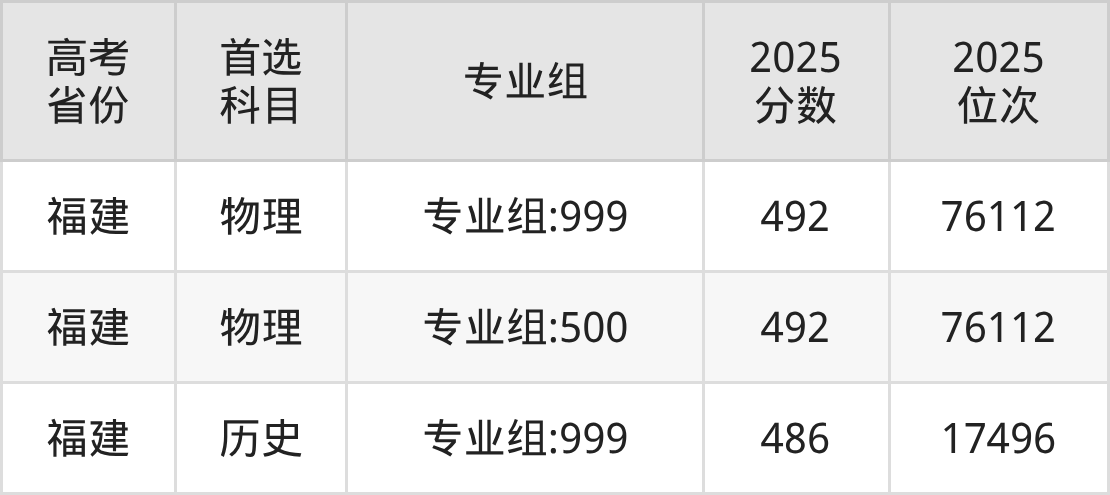 | 高考 省份 | 专业组 | 选科要求 | 2025 分数 | 2025 位次 |