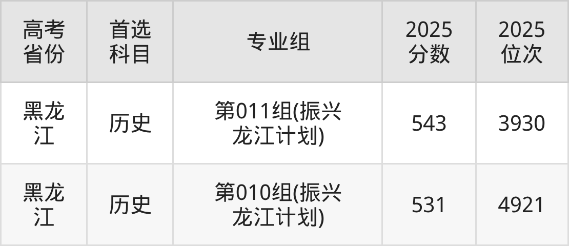 下方图片展示的是黑河学院振兴龙江计划2025年录取分数线汇总: