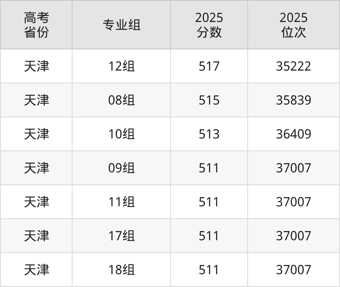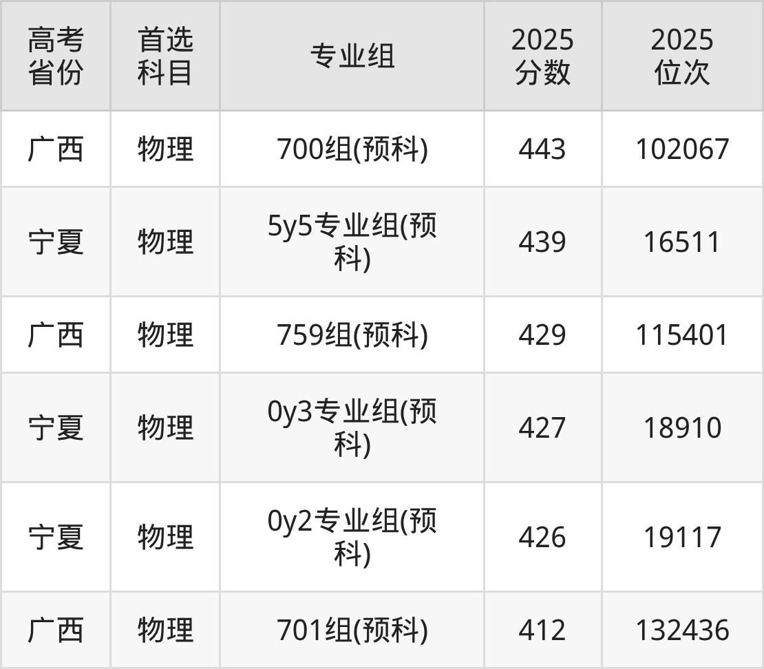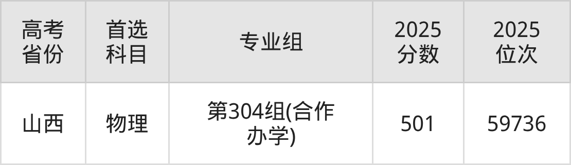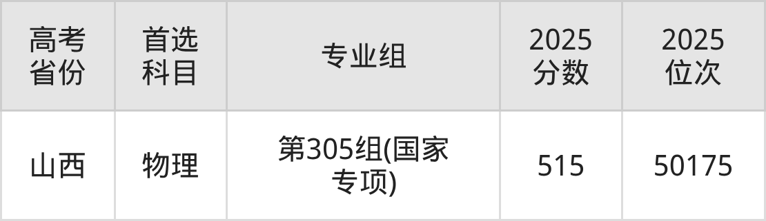 | 高考 省份 | 专业组 | 选科要求 | 2025 分数 | 2025 位次 |