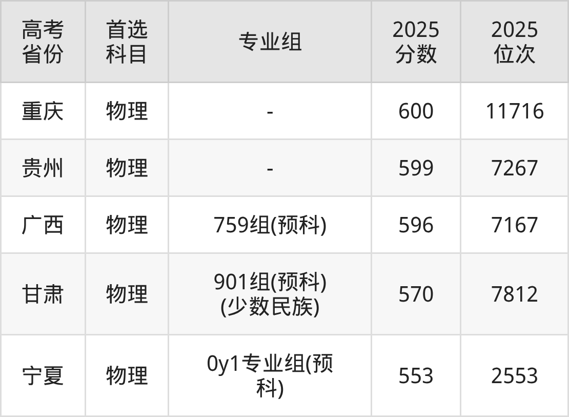 | 高考 省份 | 专业组 | 选科要求 | 2025 分数 | 2025 位次 |