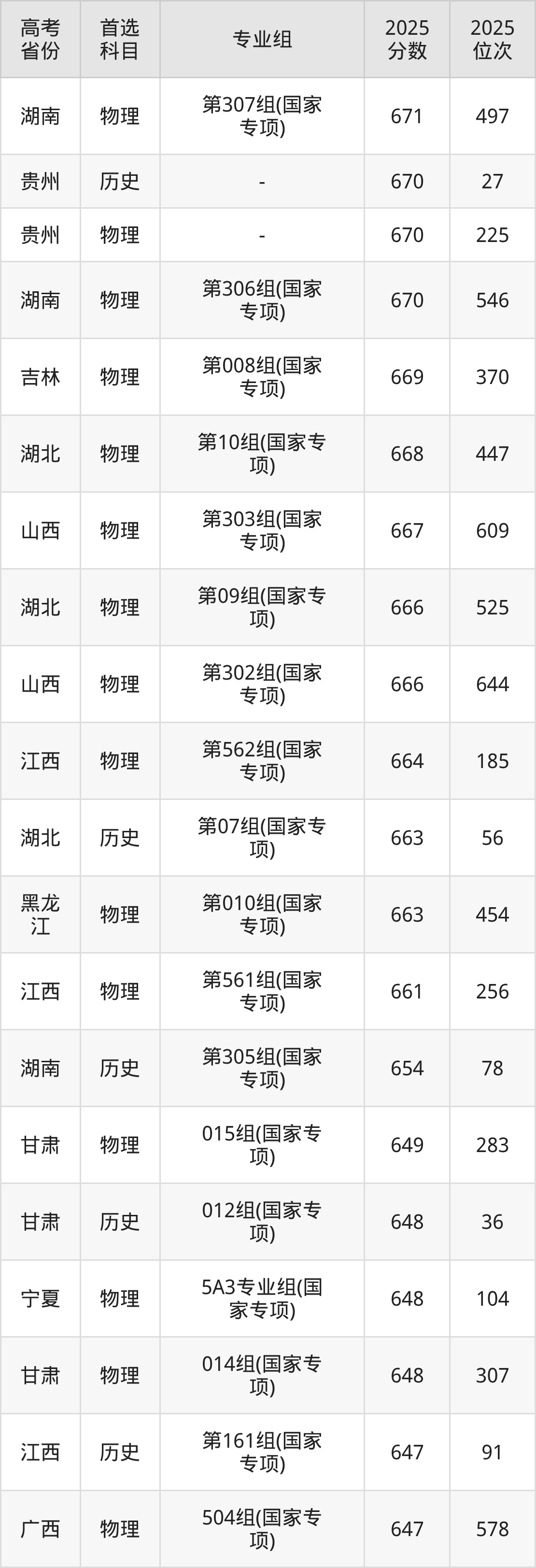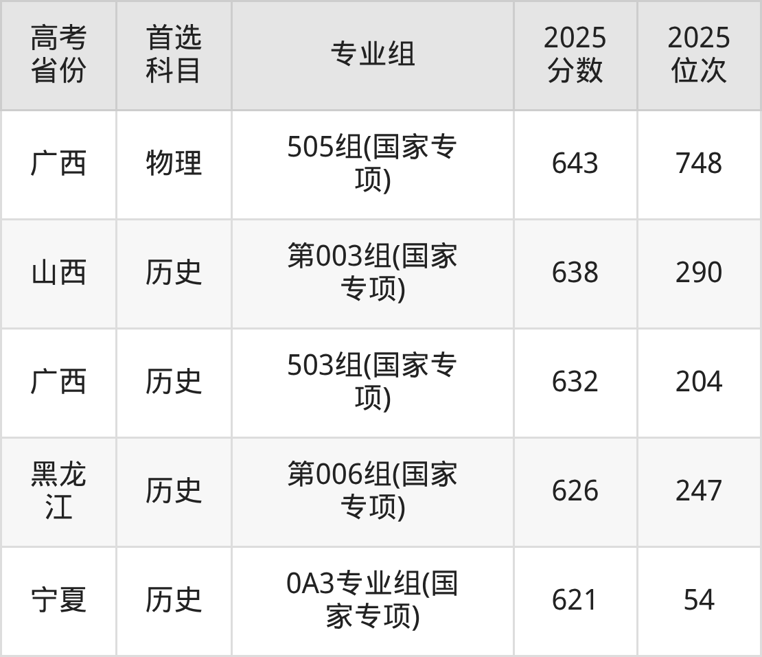 下方图片展示的是北京大学国家专项2025年录取分数线汇总: